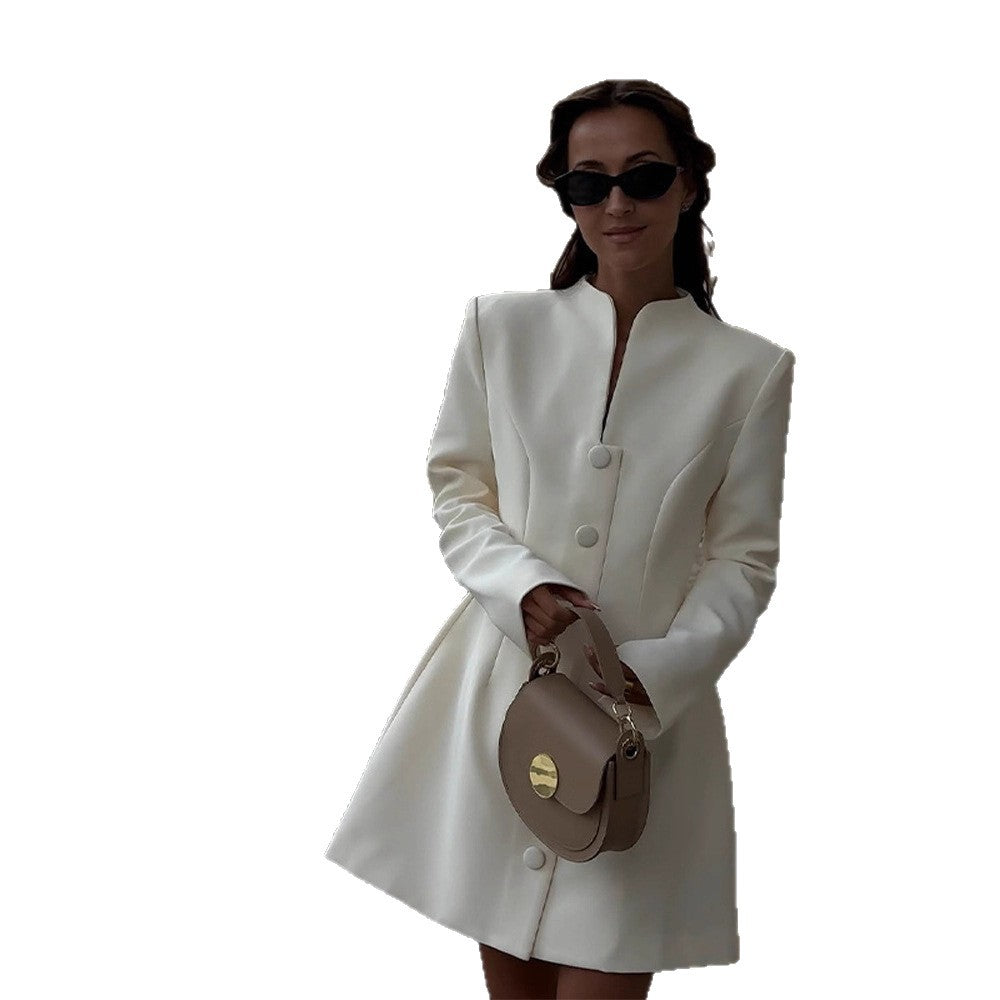 Unser Damen Blazer-Kleid Heidi-Mode ist die perfekte Kombination aus Stil und Eleganz. Dieses Kleid überzeugt durch seine moderne Silhouette und hochwertige Verarbeitung. Die raffinierte Knopfleiste und der hochgeschlossene Kragen verleihen dem Design einen edlen Look, der sich ideal für formelle Anlässe eignet.