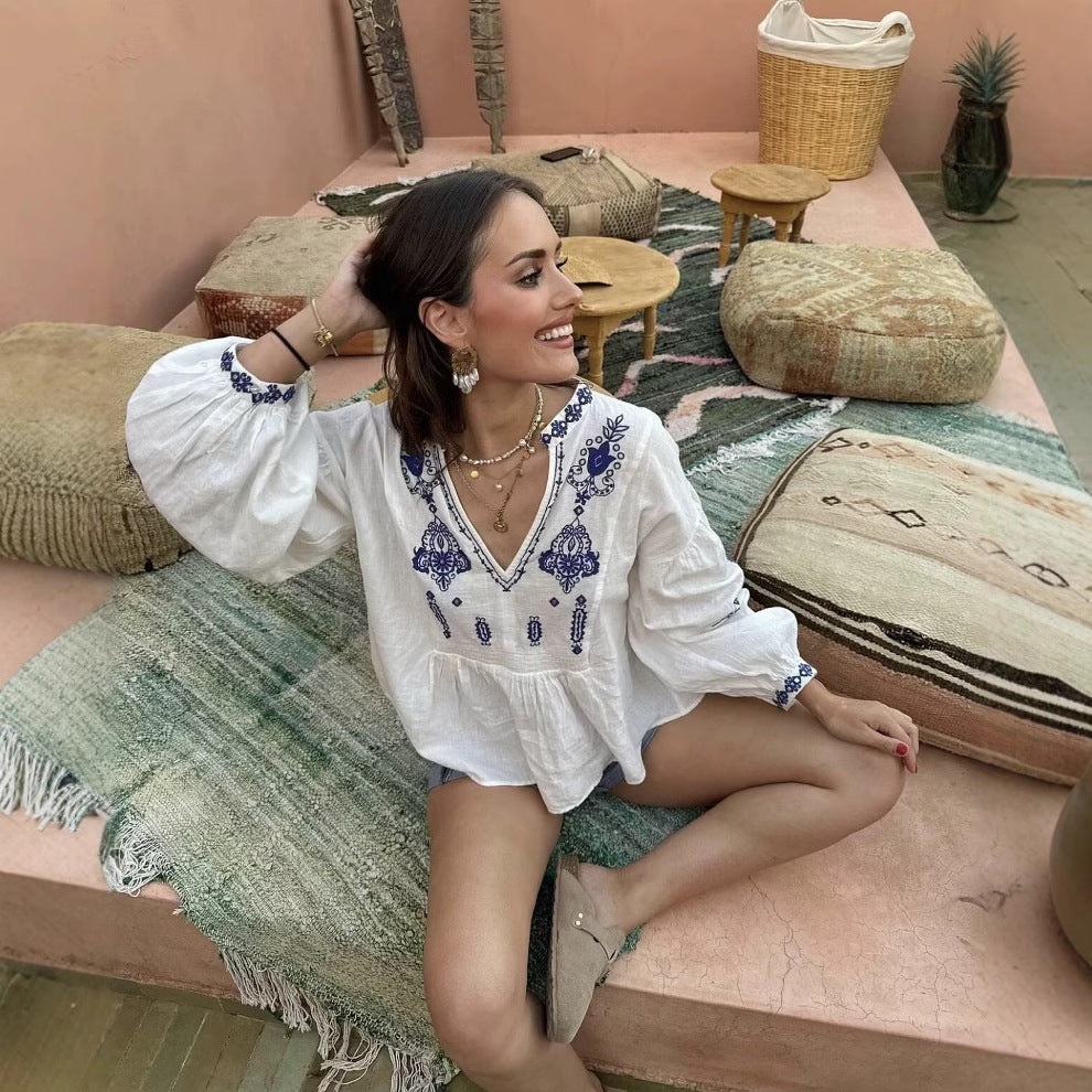 Entdecken Sie unsere zauberhafte Damenbluse, die mit einem einzigartigen floralen Stickdesign und voluminösen Ärmeln verzaubert. Diese stilvolle Bluse ist ideal für lässige Freizeit- oder festliche Anlässe.
