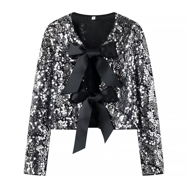 Damen elegante Lurex-Partyjacke mit Rüschen und schönen Schleifen Heidi-Mode