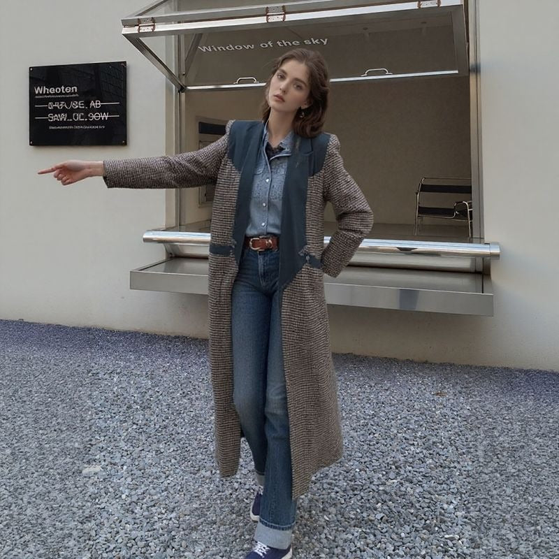 Entdecken Sie unseren stilvollen, eleganten Damenmantel mit langem Schnitt und luxuriösen samtigen Akzenten, ideal für die kalte Jahreszeit. Mit seinem einzigartigen Karomuster kombiniert dieser Mantel klassische Eleganz mit modernem Flair.