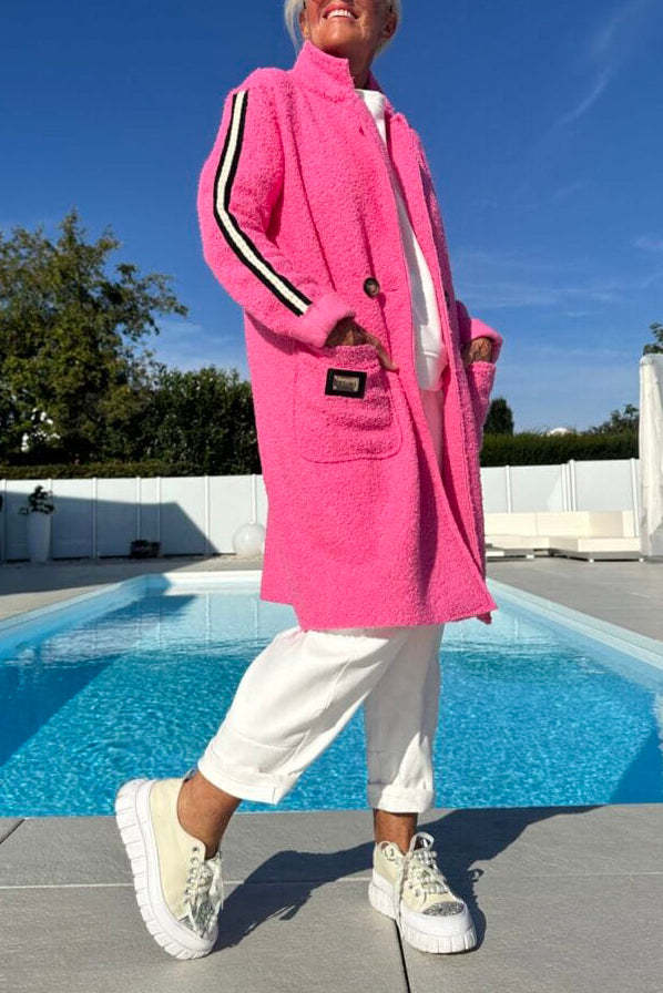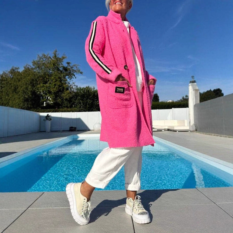 Damen eleganter Teddy-Mantel mit zwei Taschen und sportlichen Streifen Heidi-Mode
