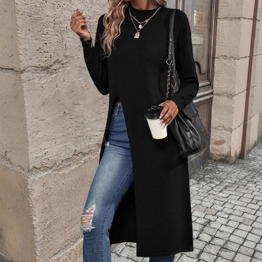 • Elegante Form: Das Kleid verfügt über einen lässigen Schnitt mit langen Ärmeln und seitlichen Schlitzen, die für eine stilvolle Silhouette sorgen.