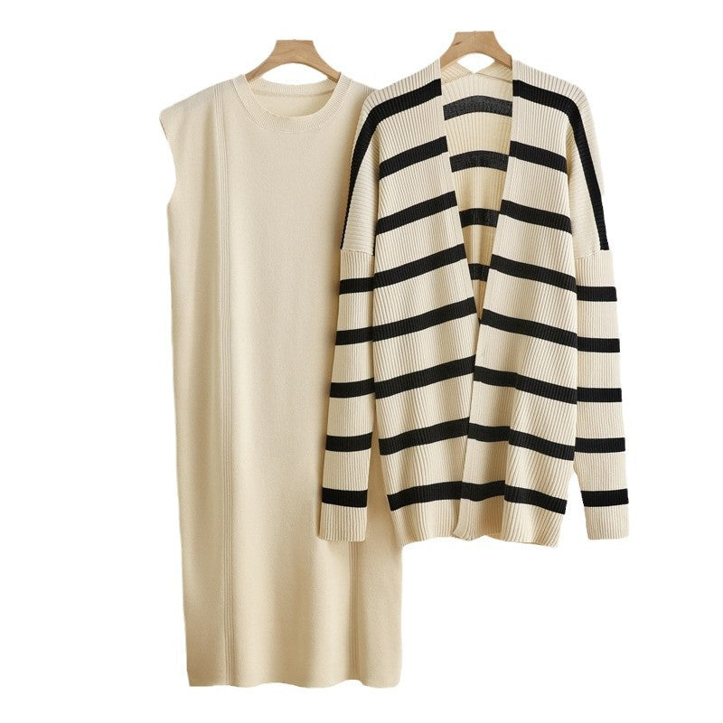 • Design: Modernes, minimalistisches Kleid mit schlichter Silhouette und einer Strickjacke mit lässigem Streifenmuster.
