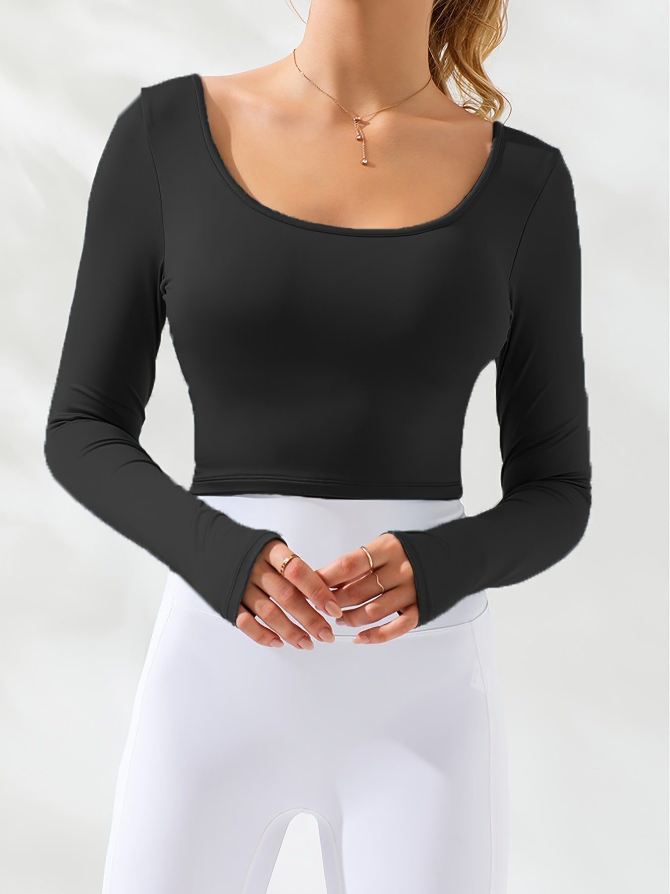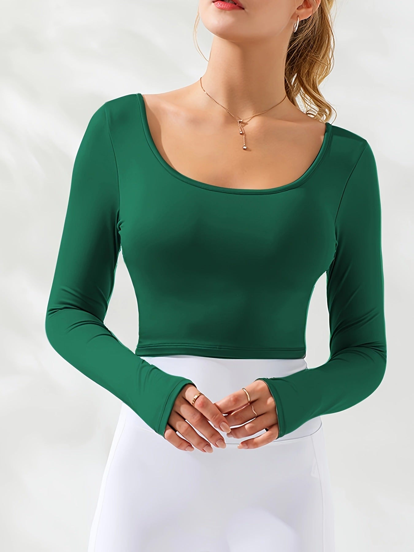 Damen figurbetontes Langarmoberteil mit Rundhalsausschnitt und Daumenlöchern Heidi-Mode