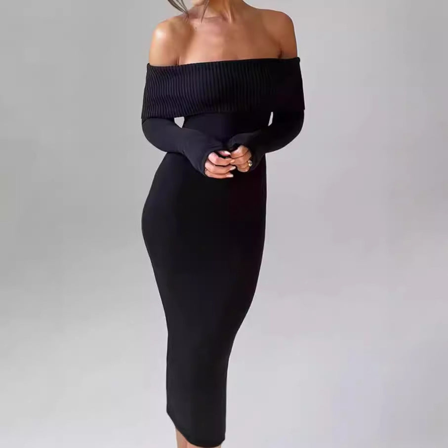 Dieses Damen Maxikleid vereint Stil und Komfort auf herausragende Weise. Mit einem verführerischen Off-Shoulder-Design und langen, enganliegenden Ärmeln sorgt es für eine feminine Silhouette.