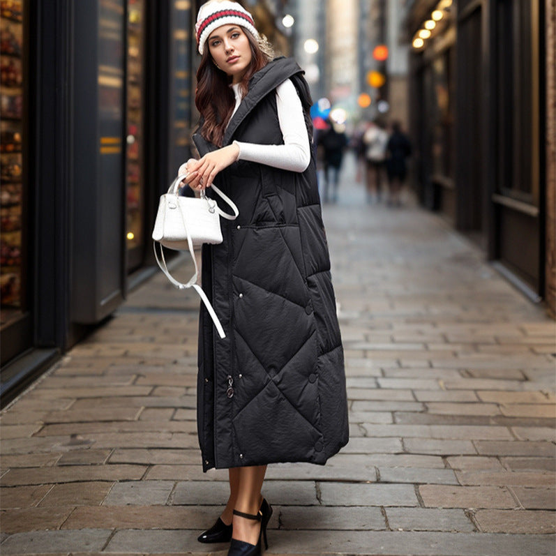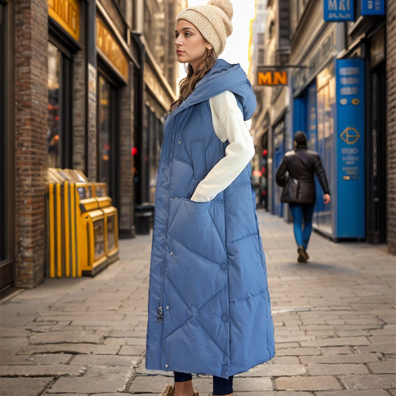 Damen gesteppte lange Weste mit isolierender Kapuze und praktischen Taschen Heidi-Mode