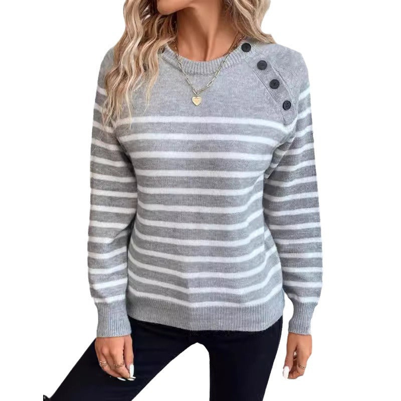 Damen gestreifter Pullover mit dekorativen Knopfdetails und Rundhalsausschnitt Heidi-Mode