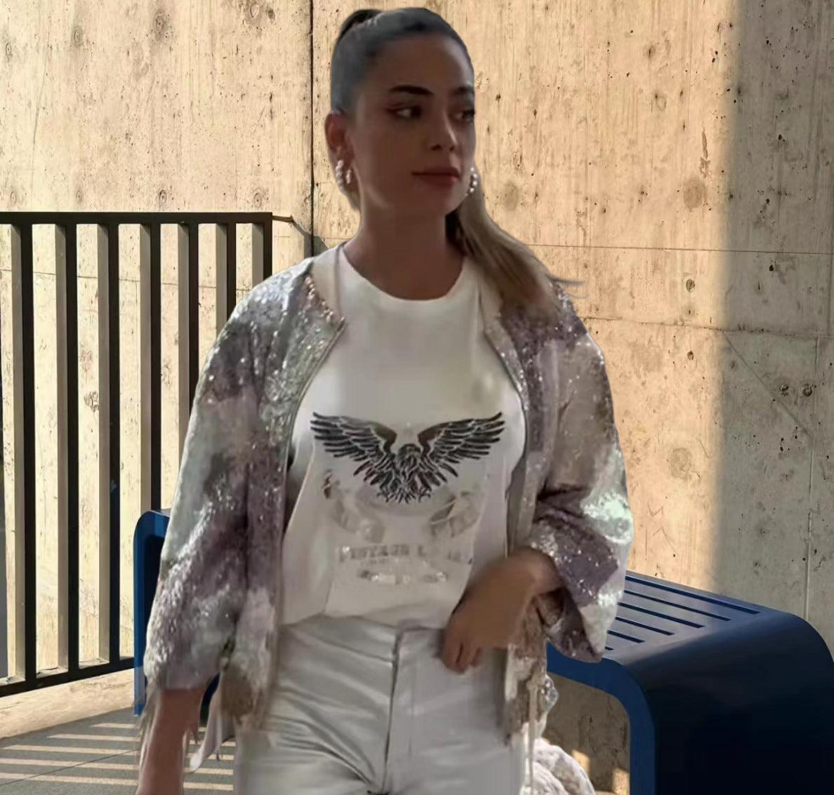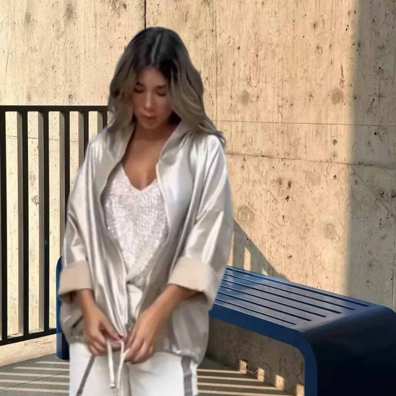 Entdecken Sie unsere Damen Glitzernde Bomberjacke mit sportlichem Flair von Heidi-Mode, die perfekt für jedes modische Outfit ist. Diese leichte Jacke kombiniert eleganten Glitzer mit lässigem Stil und sorgt für einen atemberaubenden Look, der alle Blicke auf sich zieht.