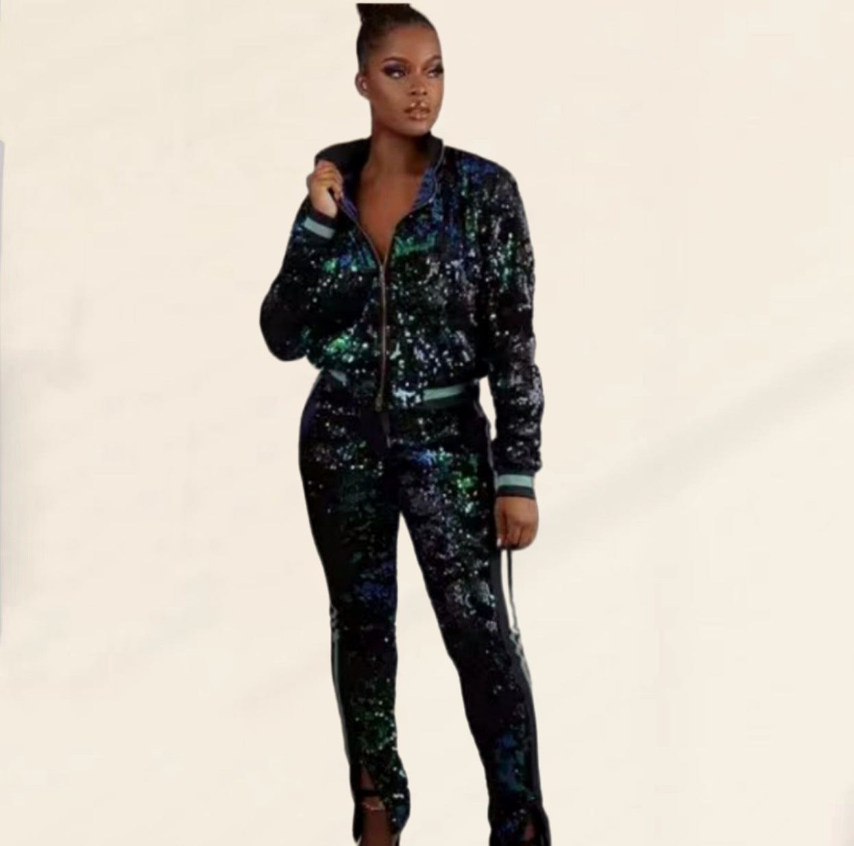 Entdecken Sie den ultimativen modischen Auftritt mit unserem glitzernden Sportanzug-Set für Damen von Heidi-Mode. Dieser auffällige Anzug kombiniert Komfort mit Stil, perfekt für jede Gelegenheit. Der schimmernde Stoff sorgt für einen glamurösen Look, während die dezenten Streifen an den Ärmeln und Beinen dem Outfit eine sportliche Note verleihen.