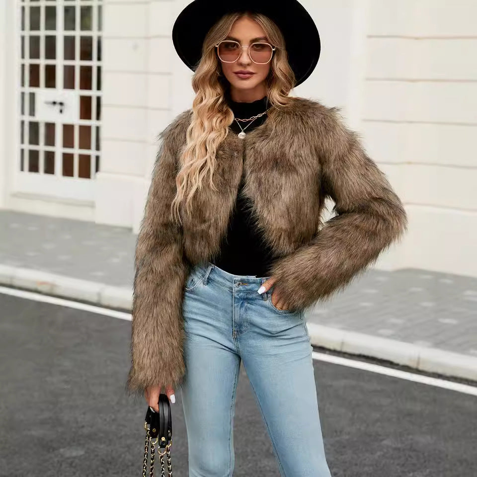 Damen Kurzjacke aus Kunstpelz mit weitem Schnitt und flauschigen Ärmeln Heidi-Mode