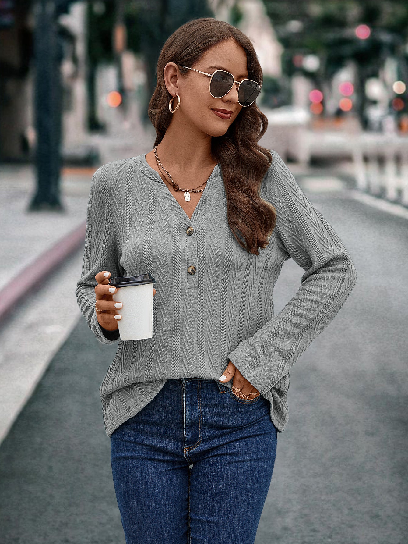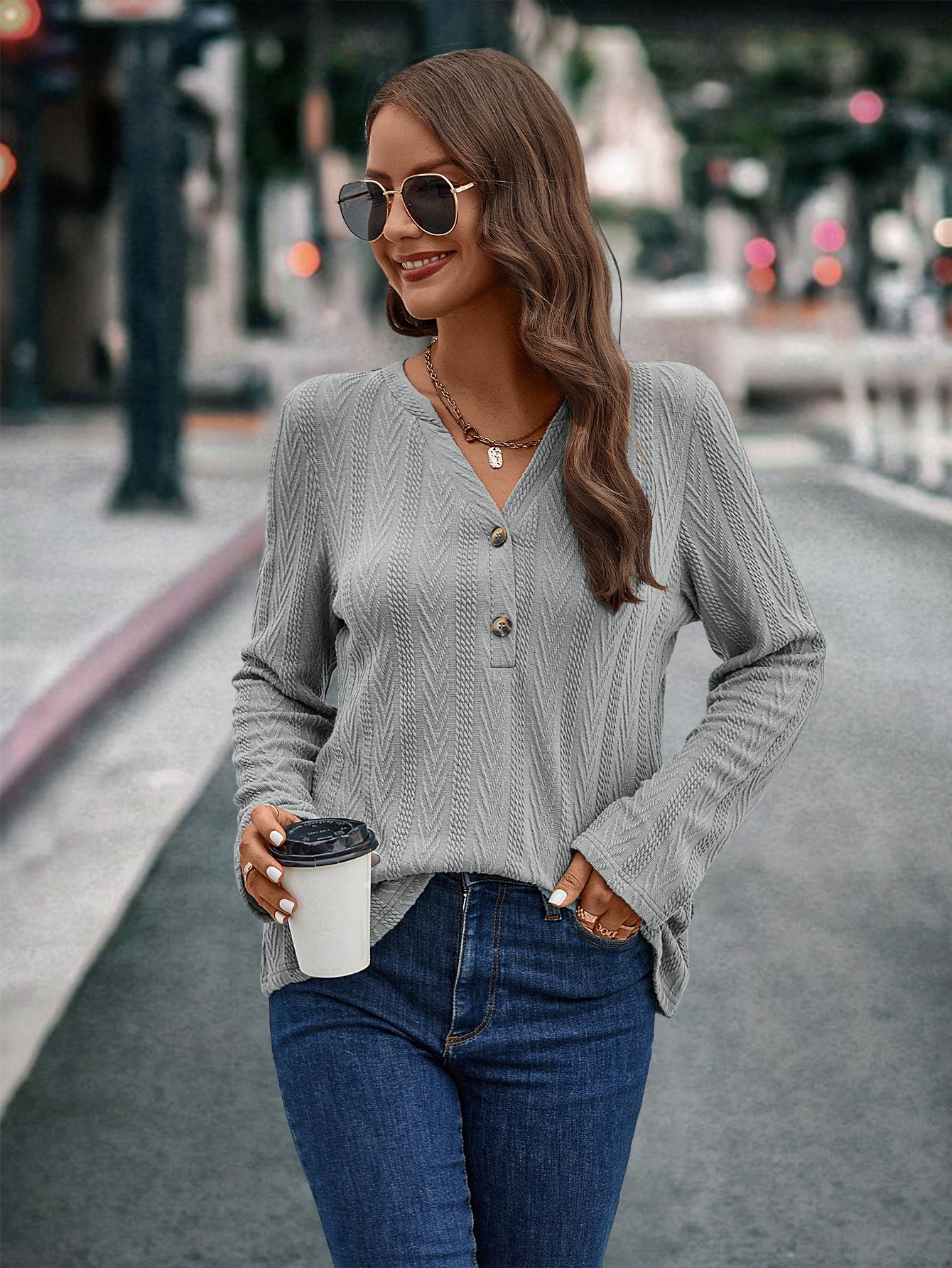 Damen Langarmbluse mit strukturiertem Muster und Knopfdetail Heidi-Mode