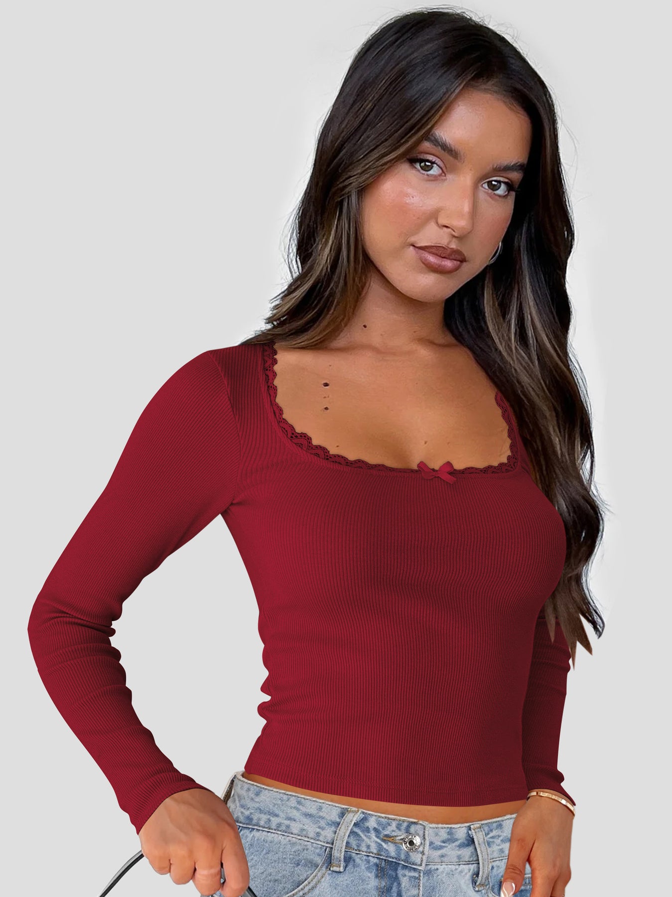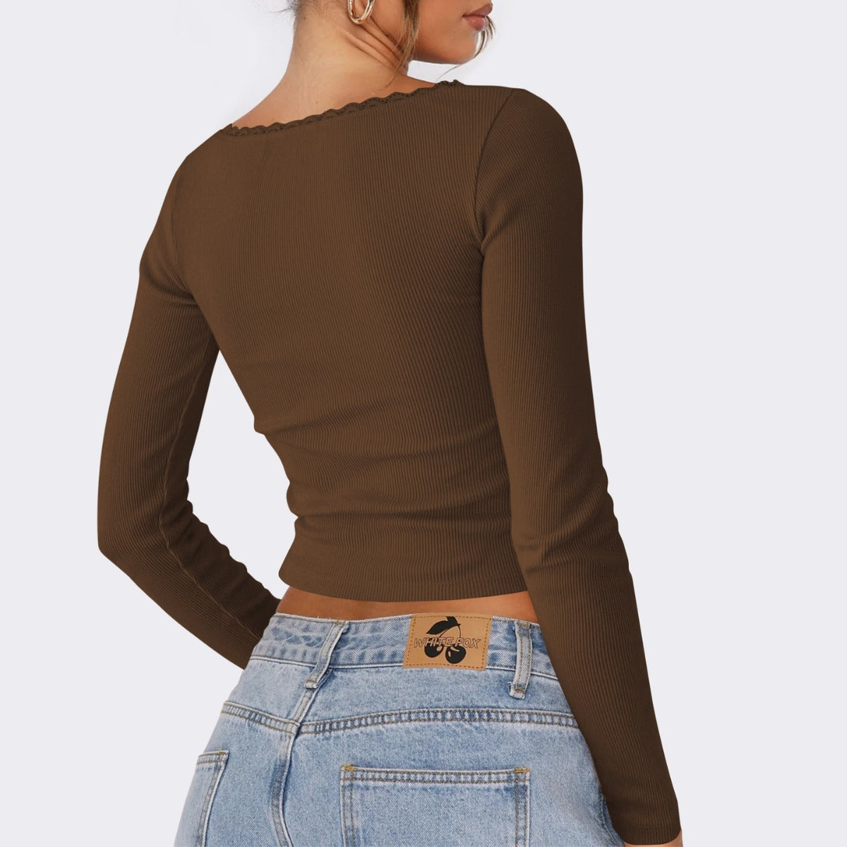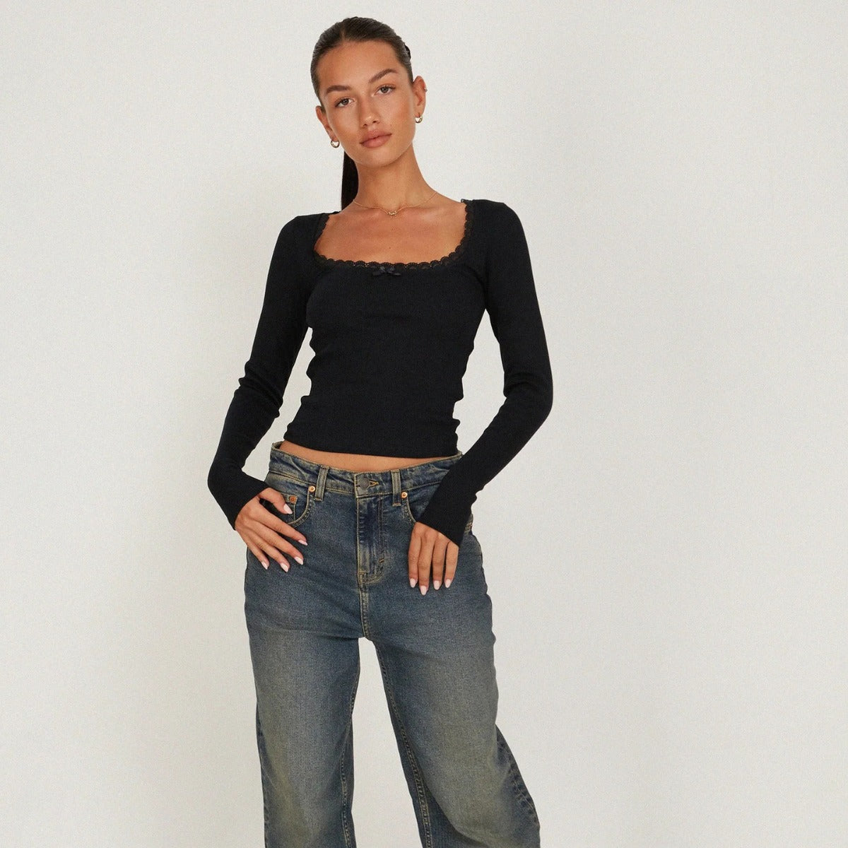 Damen Langarmoberteil mit feiner Spitzenkante und figurbetontem Schnitt Heidi-Mode