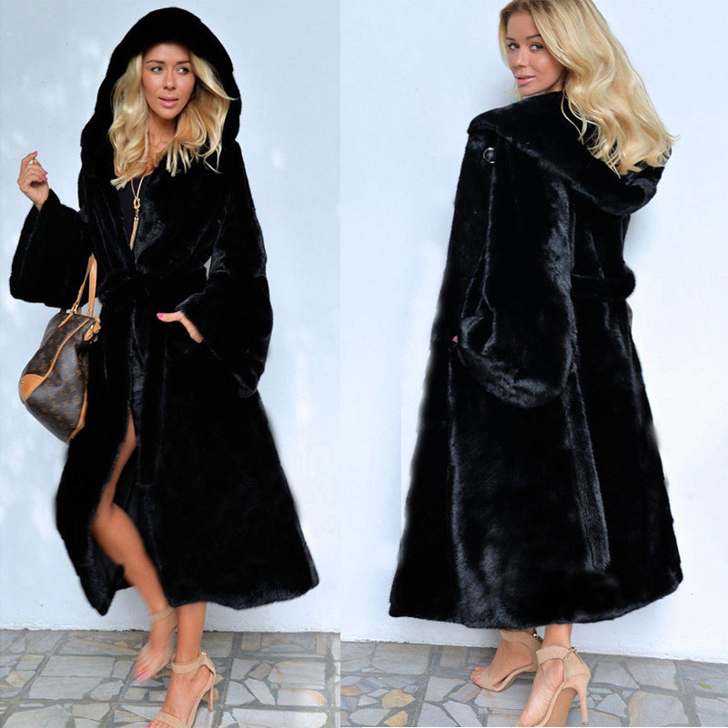 Damen Langer Kapuzenmantel aus Kunstfell mit Gürtel Heidi-Mode