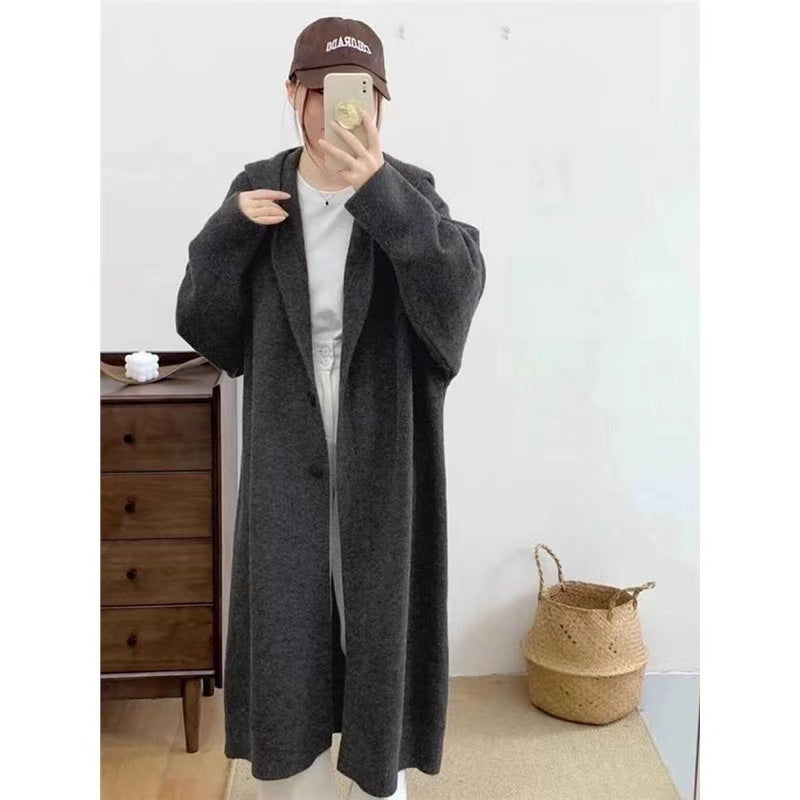Damen Langer Strickcardigan mit Kapuze und praktischen Knöpfen Heidi-Mode