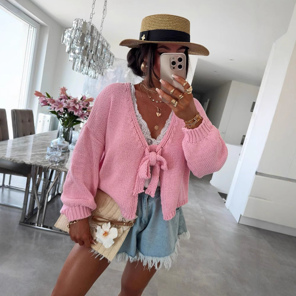 Damen lässige Strickjacke mit Bindeverschluss und weiten Ärmeln Heidi-Mode