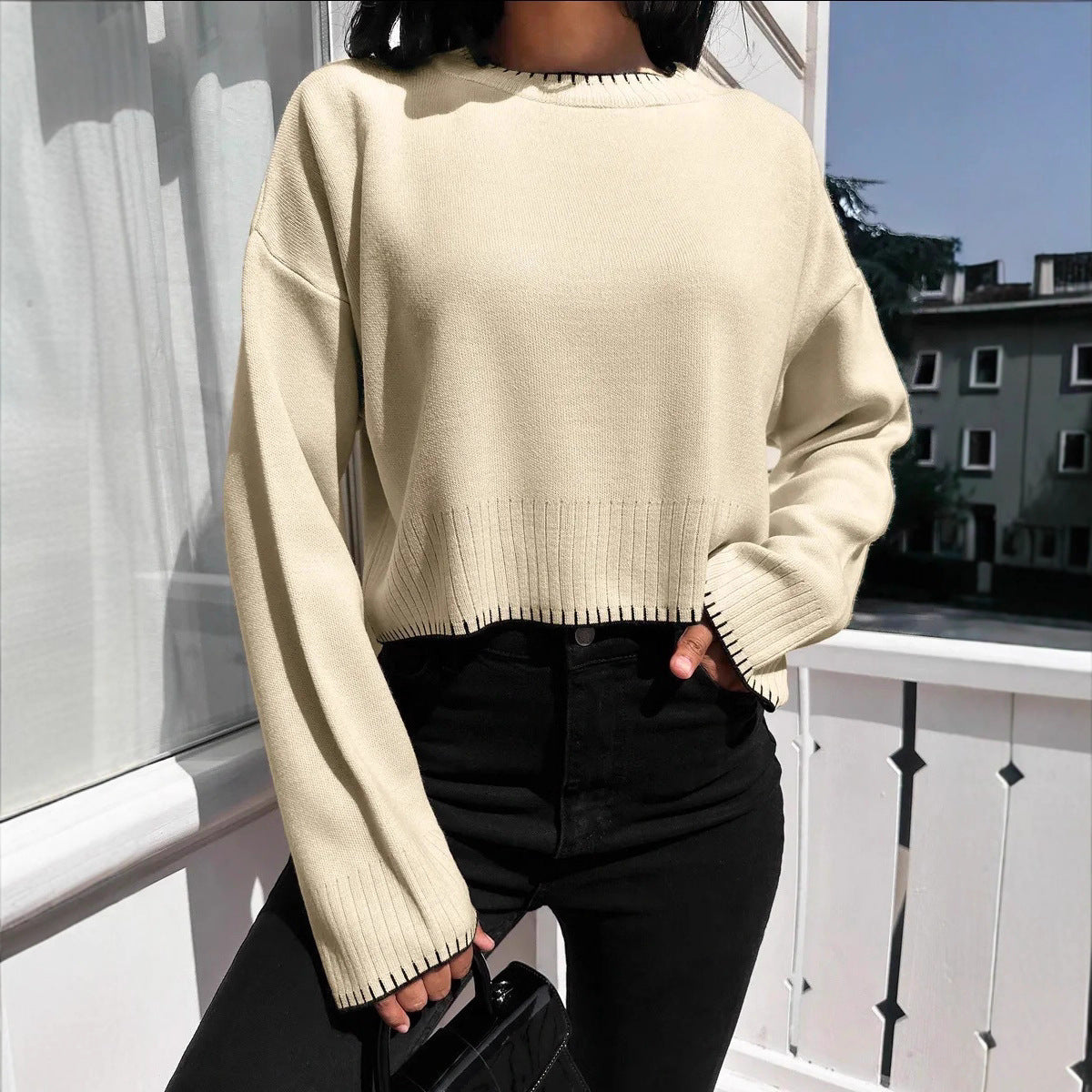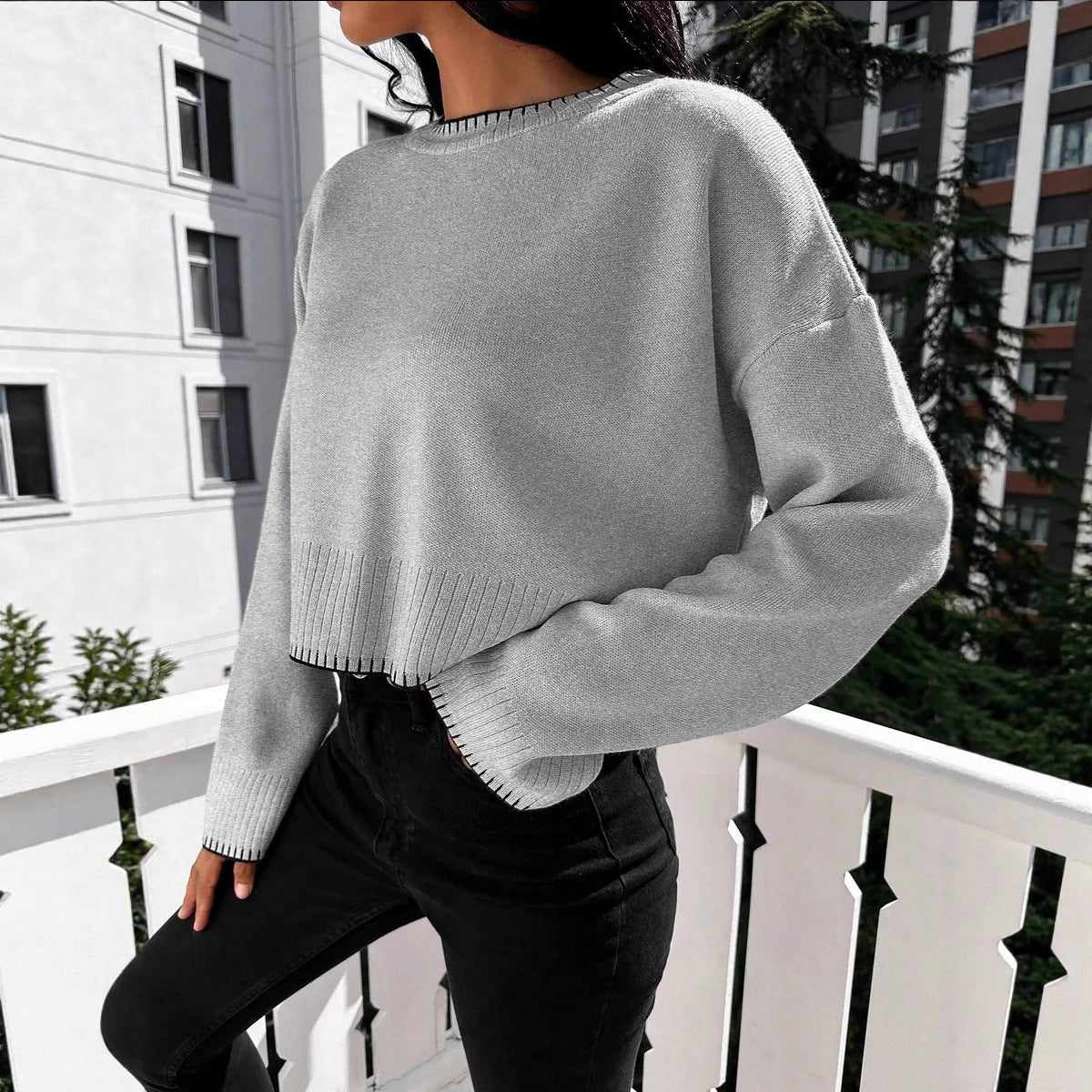 Damen lässiger Crop-Pullover mit strukturierten Säumen und Rundhalsausschnitt Heidi-Mode