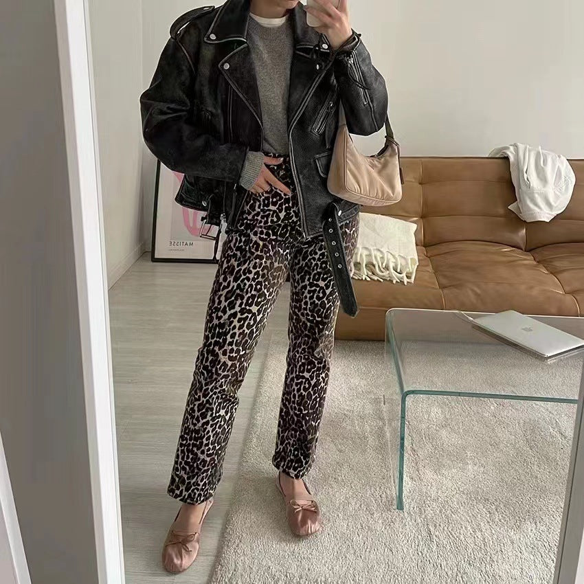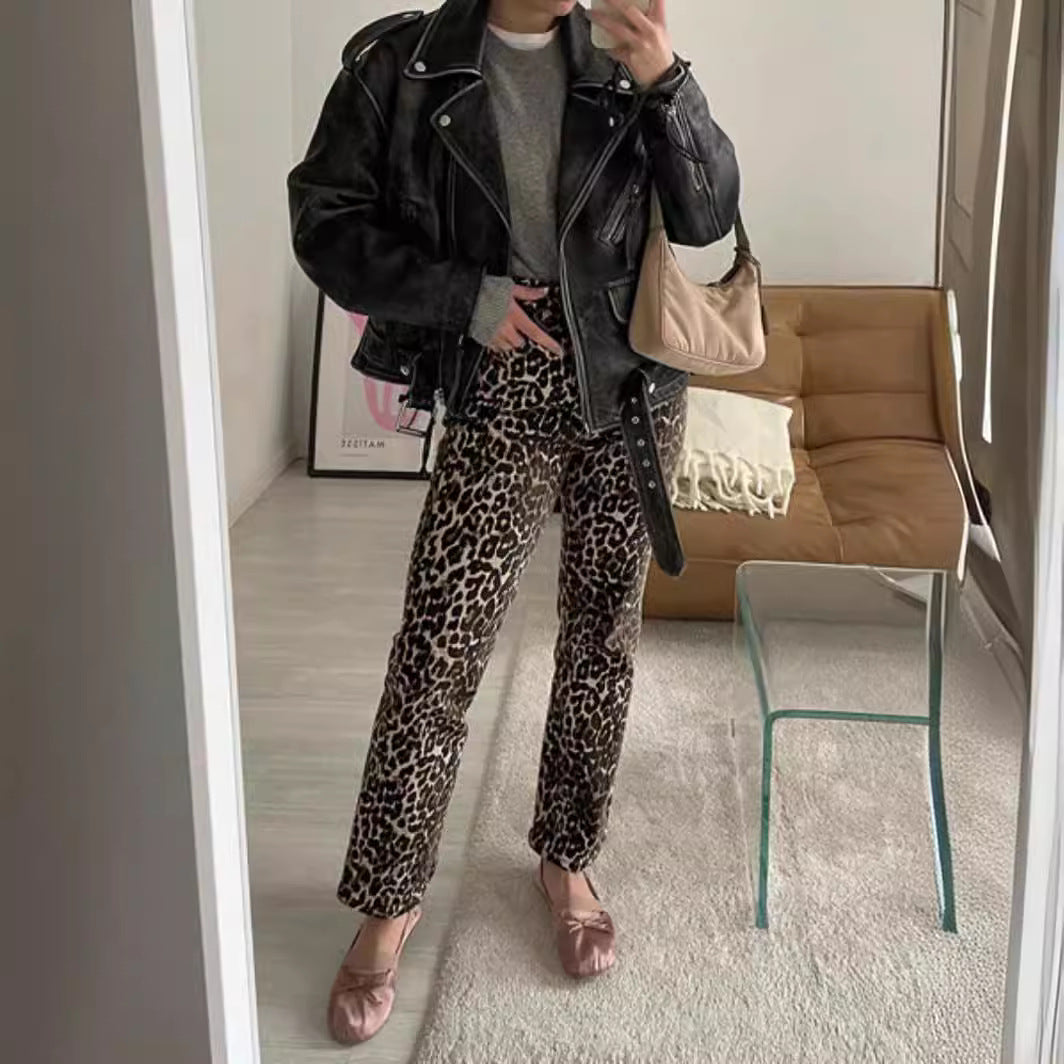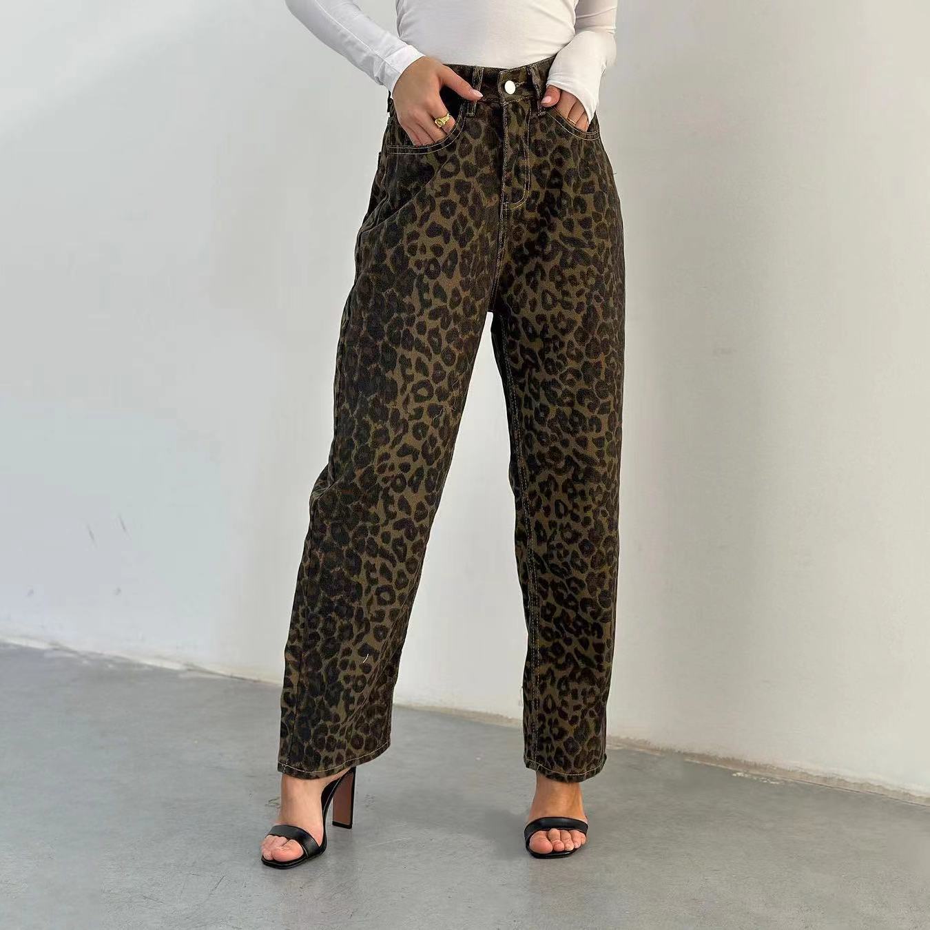 Setzen Sie ein modisches Statement und tragen Sie die Damen Leo-Print Jeanshose zu Ihren Lieblings-Outfits!