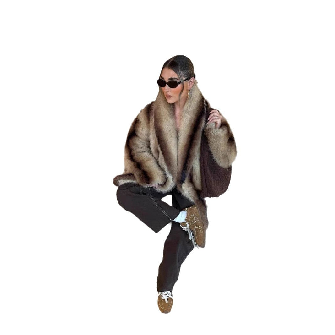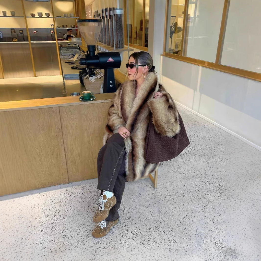 Damen luxuriöser Kunstfellmantel mit breitem Kragen und eleganten Details Heidi-Mode