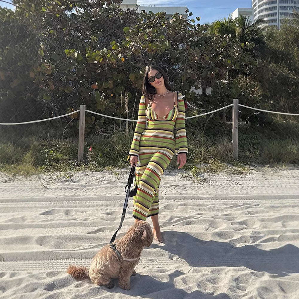 Damen Maxi-Kleid mit einzigartigem Streifenmuster und weitem Arm Heidi-Mode