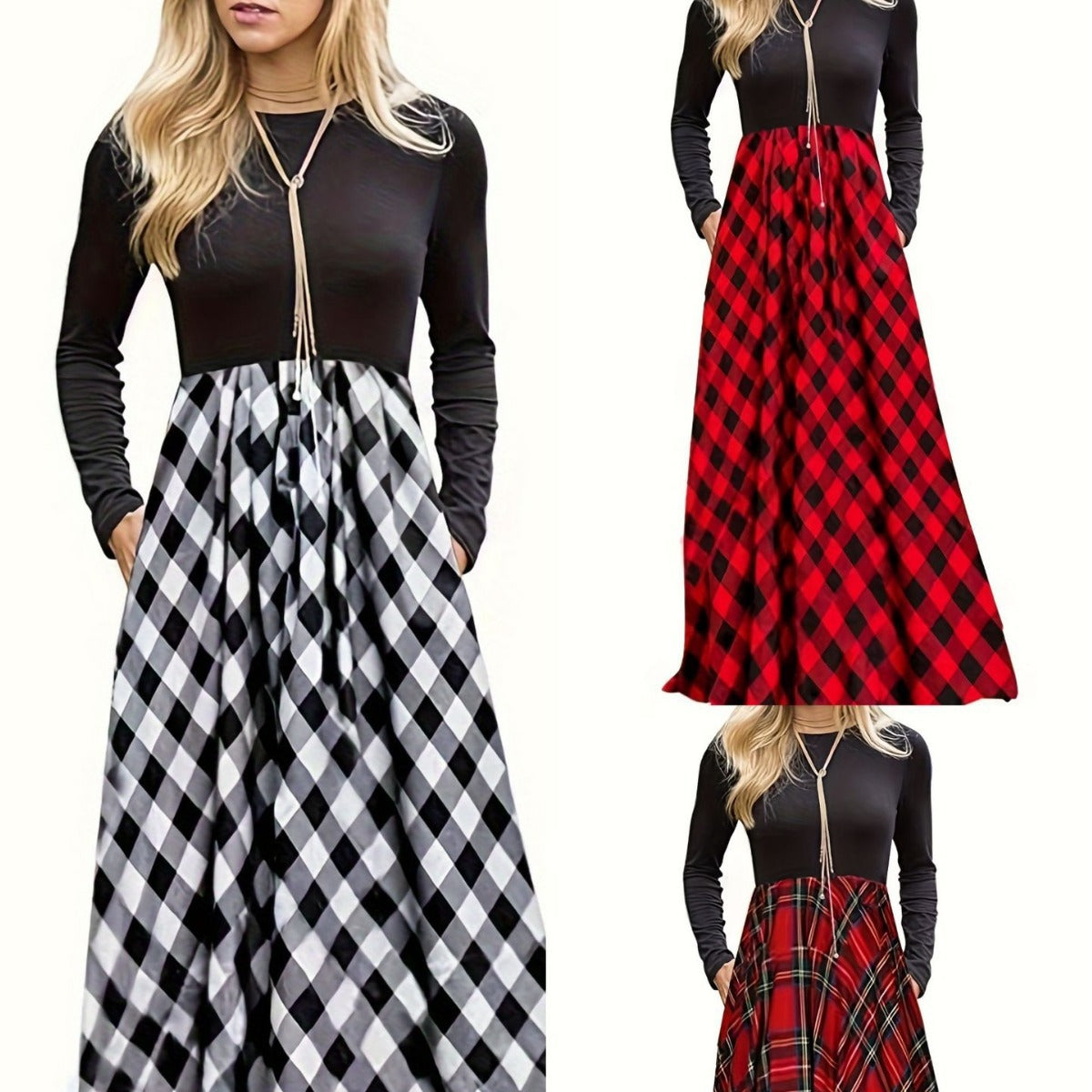Damen Maxikleid mit modernem Karomuster und langen Ärmeln Heidi-Mode