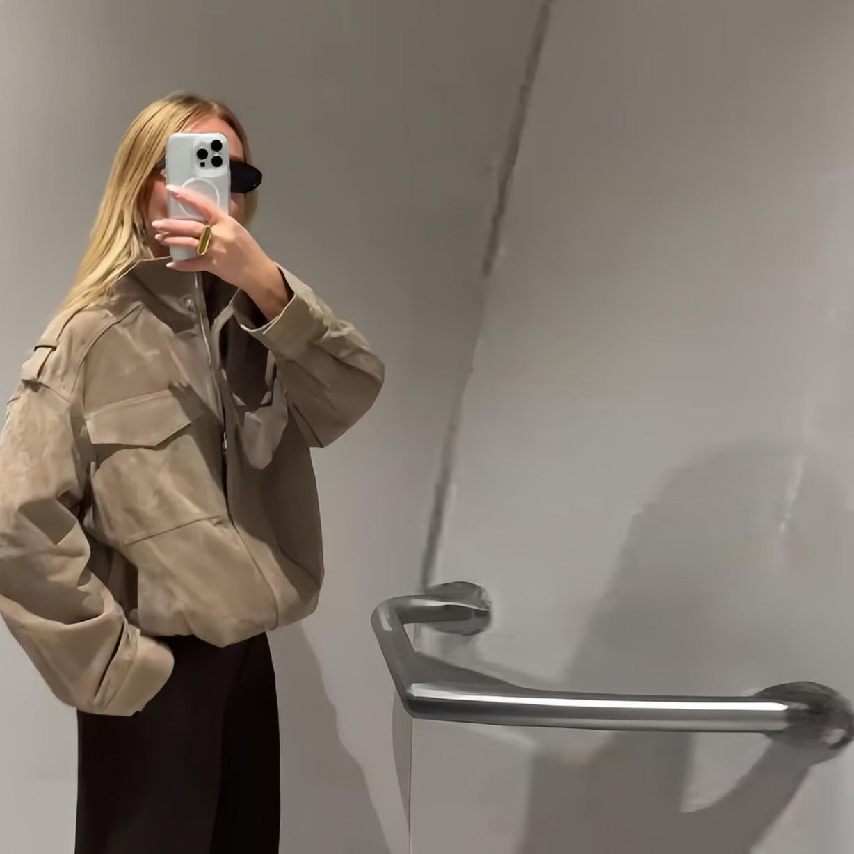 Damen Modische Oversized-Wildlederjacke mit praktischen Taschen und hohem Kragen Heidi-Mode