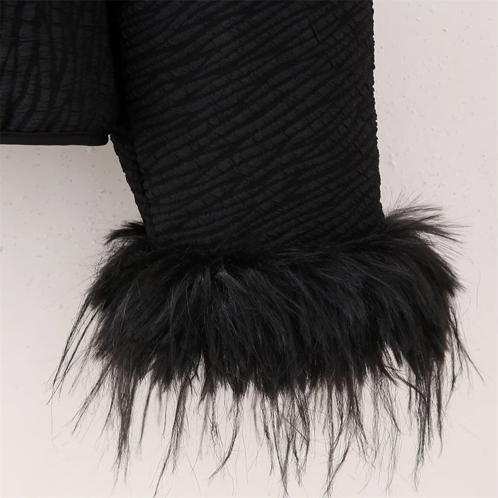 Damen modische Steppjacke mit raffiniertem Bindegürtel und eleganten Fuchsfell-Ärmeln Heidi-Mode