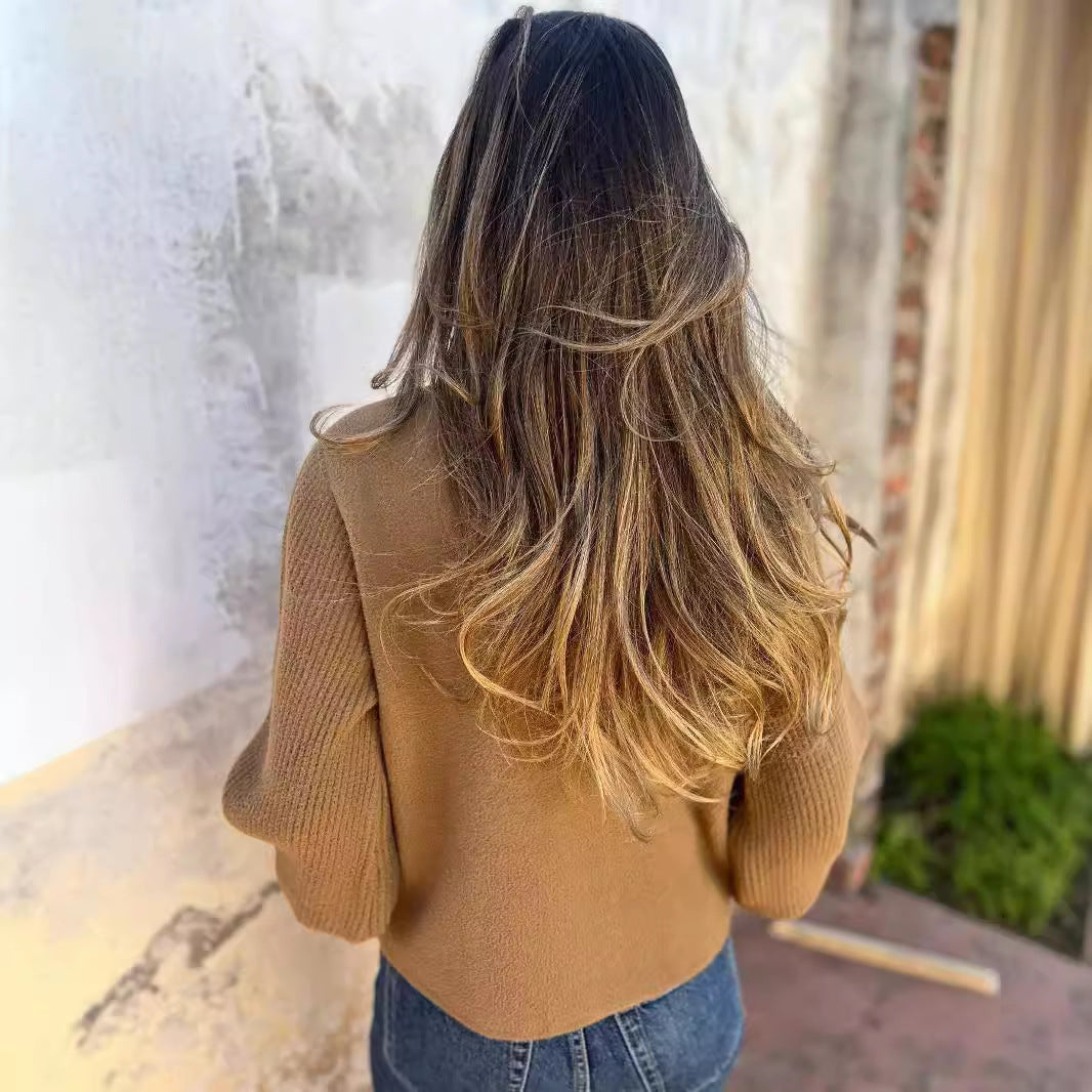 • V-Ausschnitt und weite Ärmel: Der V-Ausschnitt und die am Ärmel weit geschnittenen Details verleihen der Jacke eine feminine Silhouette und eine modische Note.
