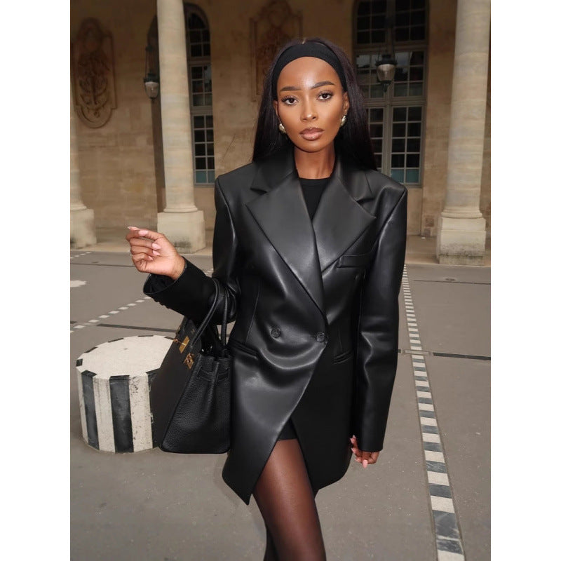Damen Oversized Blazer aus hochwertigem Kunstleder mit doppelter Knopfverschluss Heidi-Mode