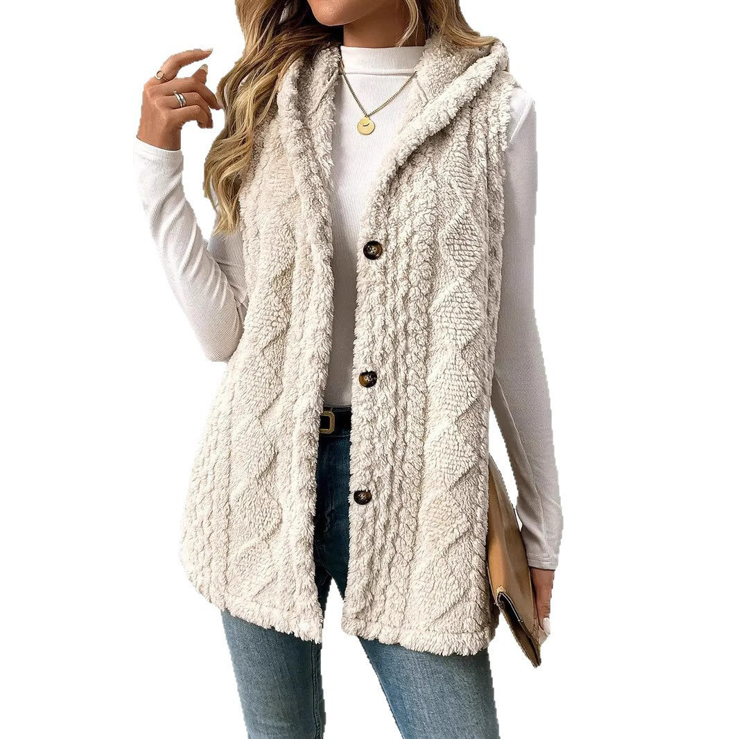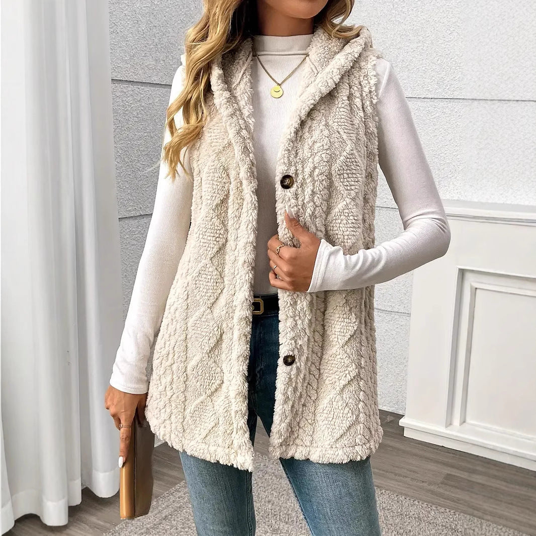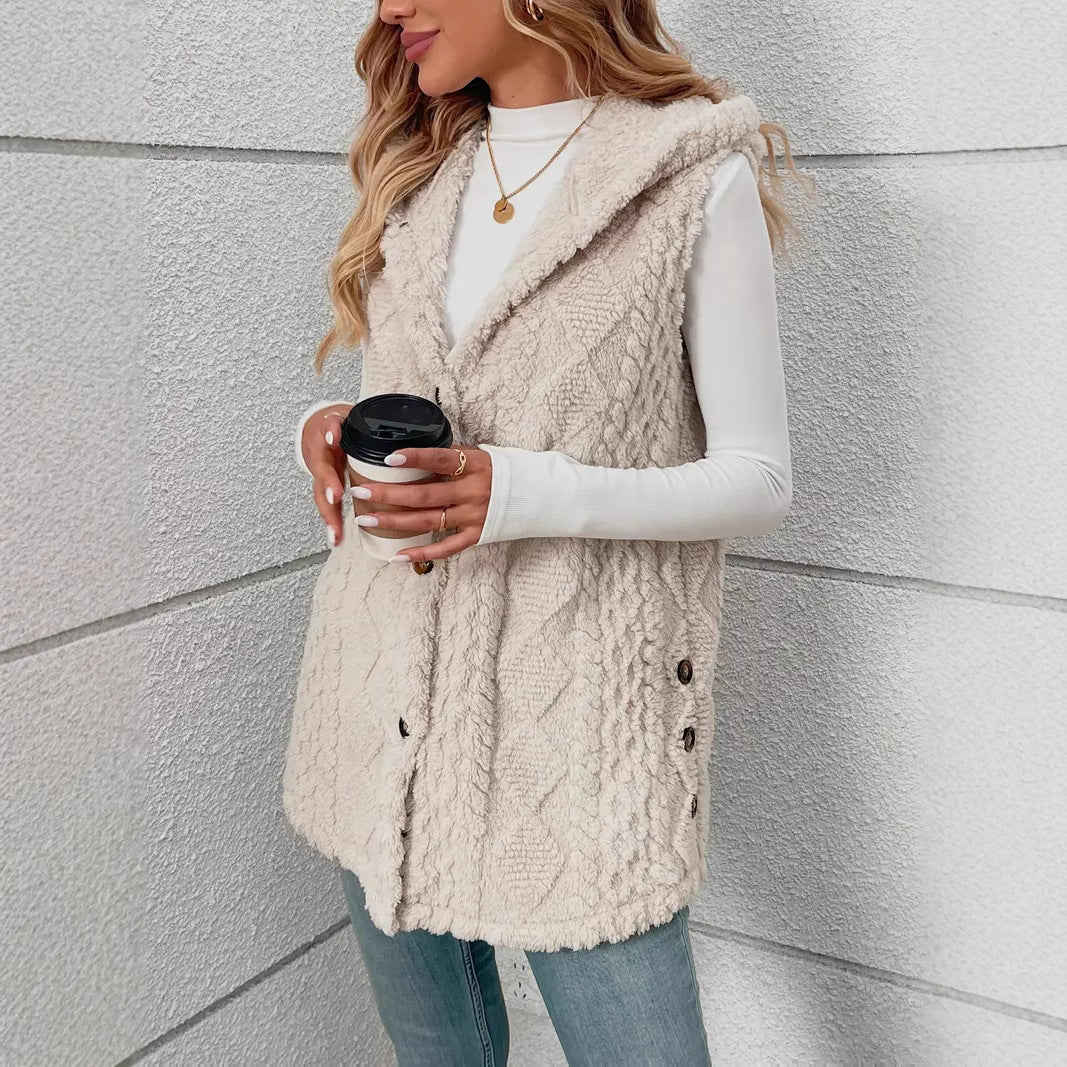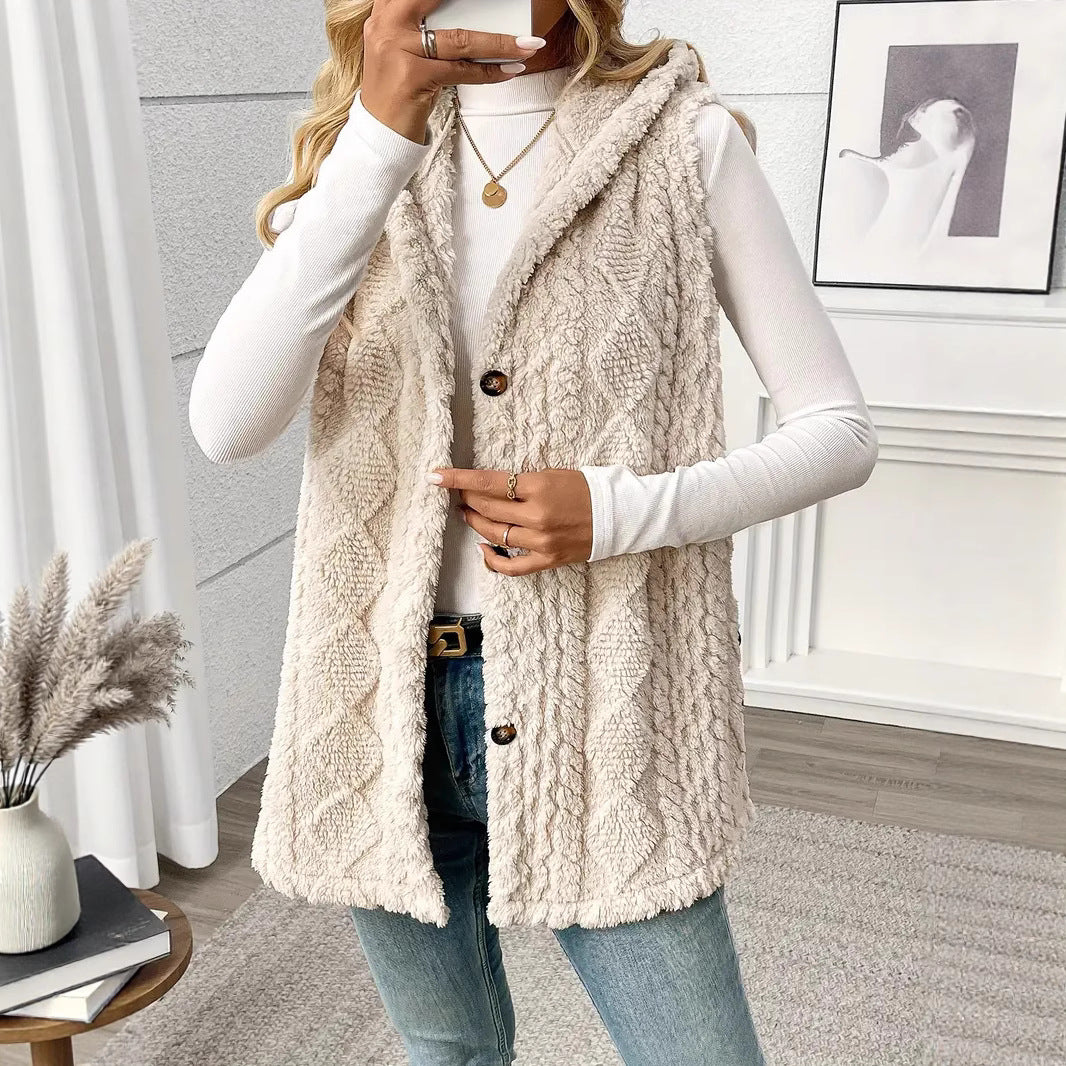 Damen Plüschweste mit Kapuze und Knopfverschluss Heidi-Mode