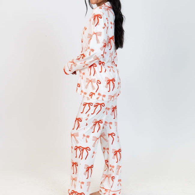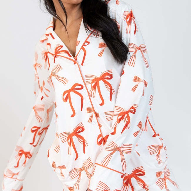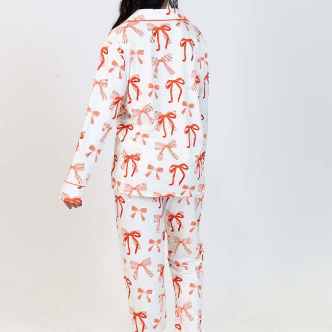 Erleben Sie höchsten Komfort mit unserem Damen Schlafanzug-Set, das mit einem verspielten Schleifenmuster verziert ist. Ideal für entspannte Nächte und gemütliche Morgen.