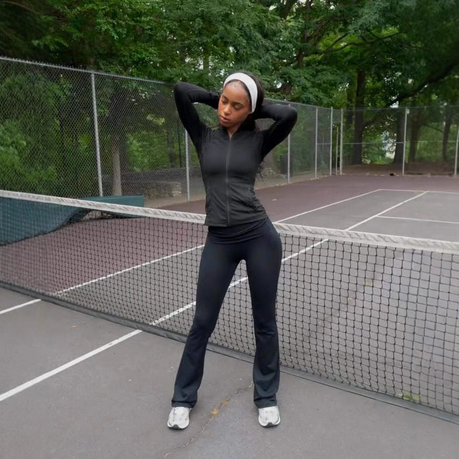 Damen sportlicher Zweiteiler mit langärmligem Reißverschluss-Oberteil und flared Hose Heidi-Mode