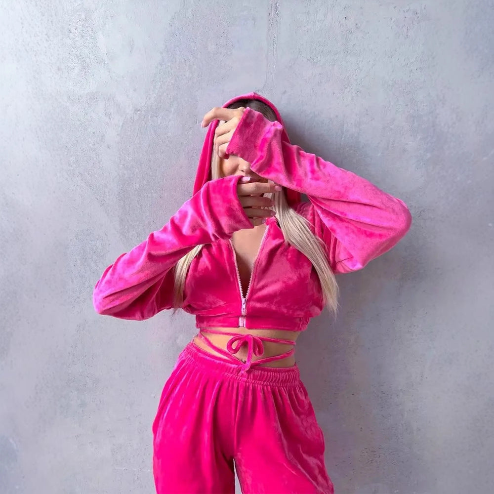 • Kombination aus Hoodie und Jogginghose: Das Set beinhaltet einen cropped Hoodie und eine passende Jogginghose, die vielseitig einsetzbar sind.