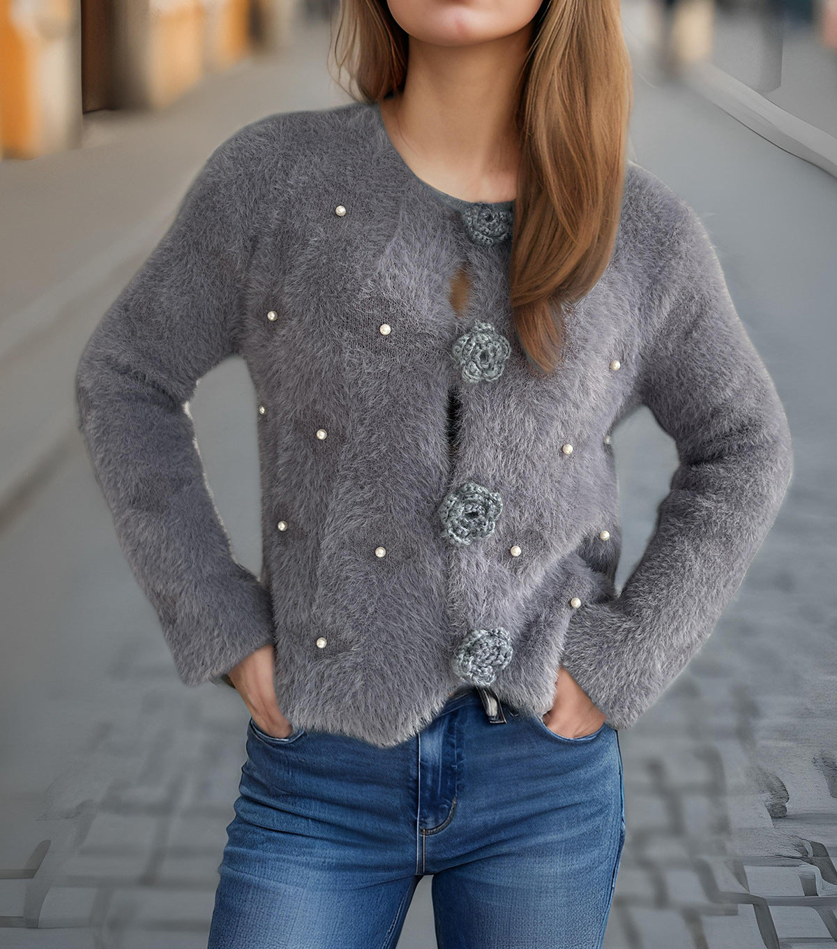 Damen Strickjacke mit floralen Applikationen und perlverzierter Detail Heidi-Mode
