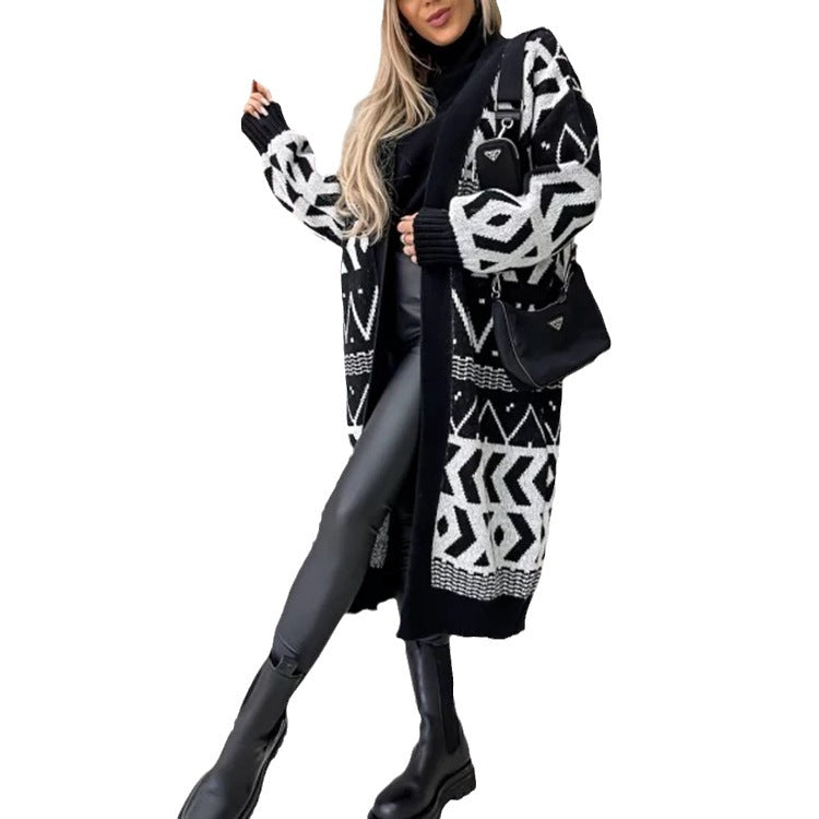 Dieser modische Damen Strickmantel vereint Komfort und Stil in einem modernen Design. Mit einem auffälligen grafischen Muster bietet er eine wunderbare Ergänzung für jede Garderobe.