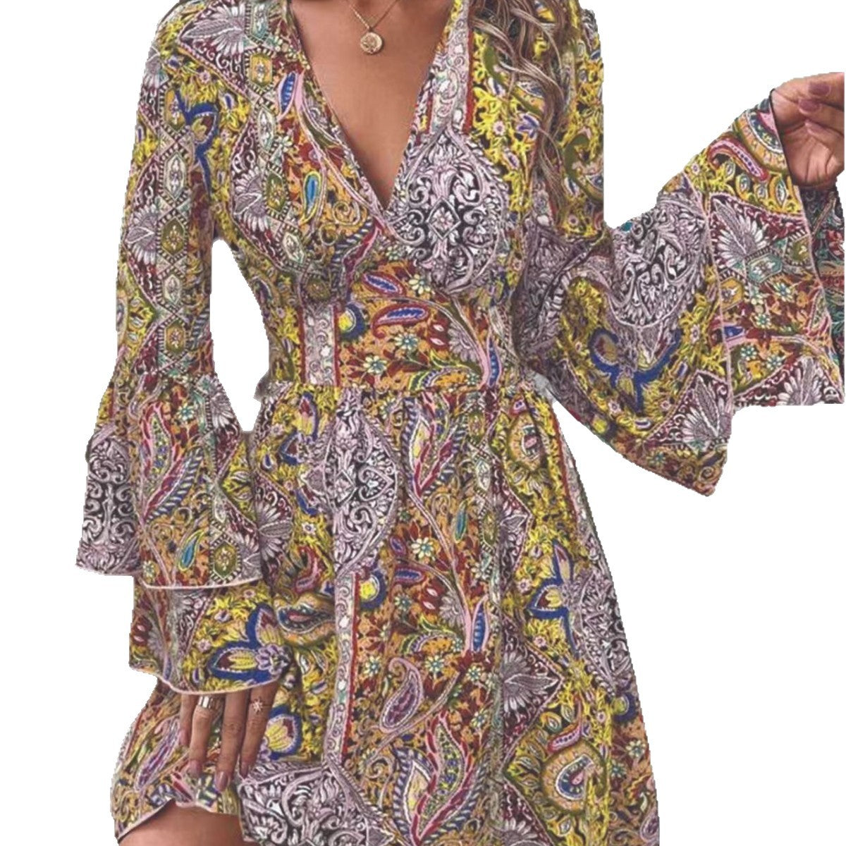 Damen V-Ausschnitt Kleid mit weiten Ärmeln und Paisleymuster Heidi-Mode