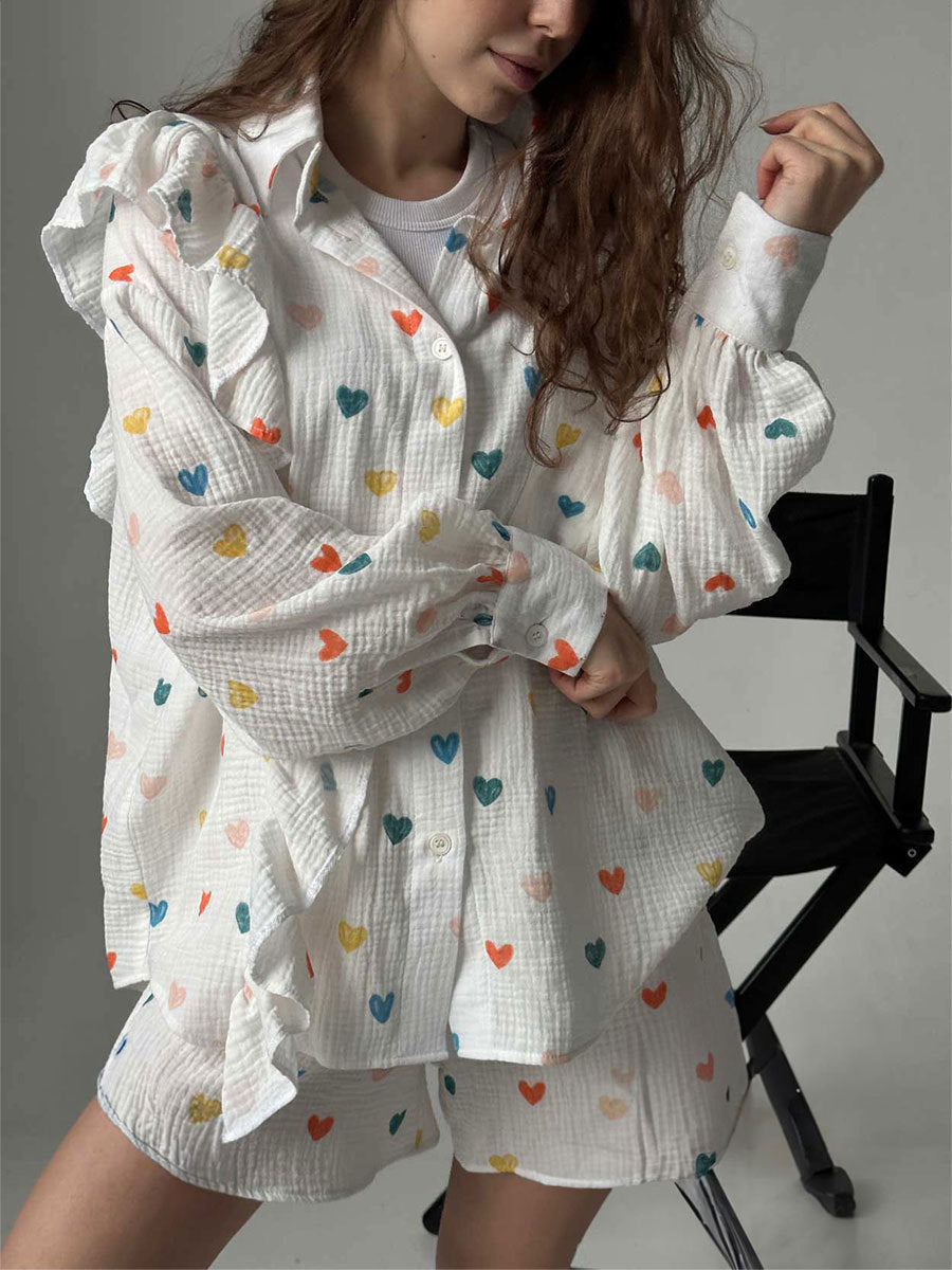 Damen Verspieltes Kurzarm-Oberteil und Shorts-Set mit Herz-Muster Heidi-Mode