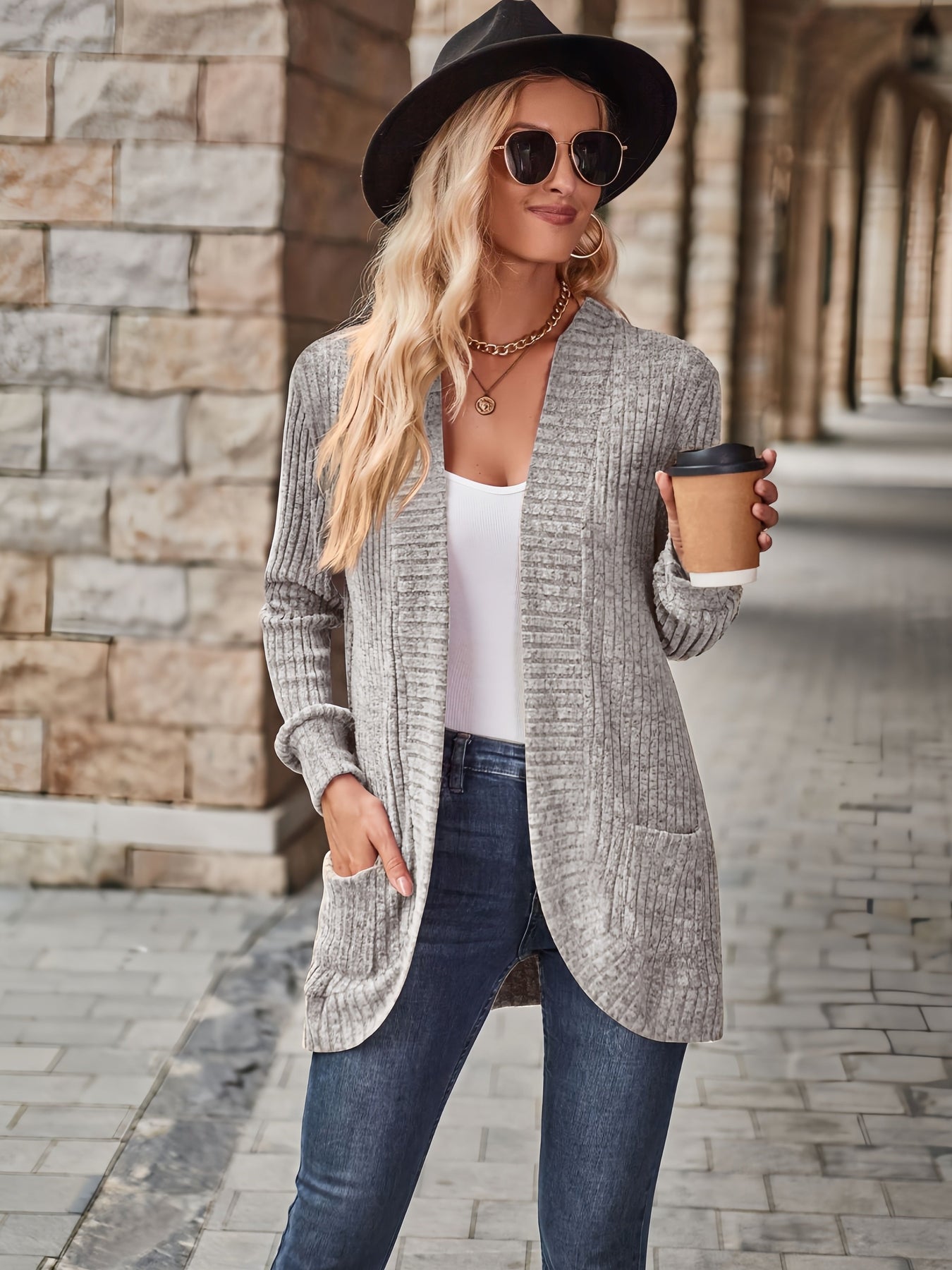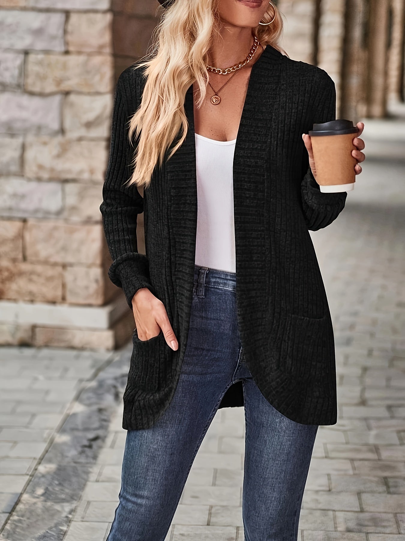 Heidi-Mode | Damen Gerippter Offener Vorderseite Strickjacke Lange Ärmeln Lässig Strickpullover mit Taschen