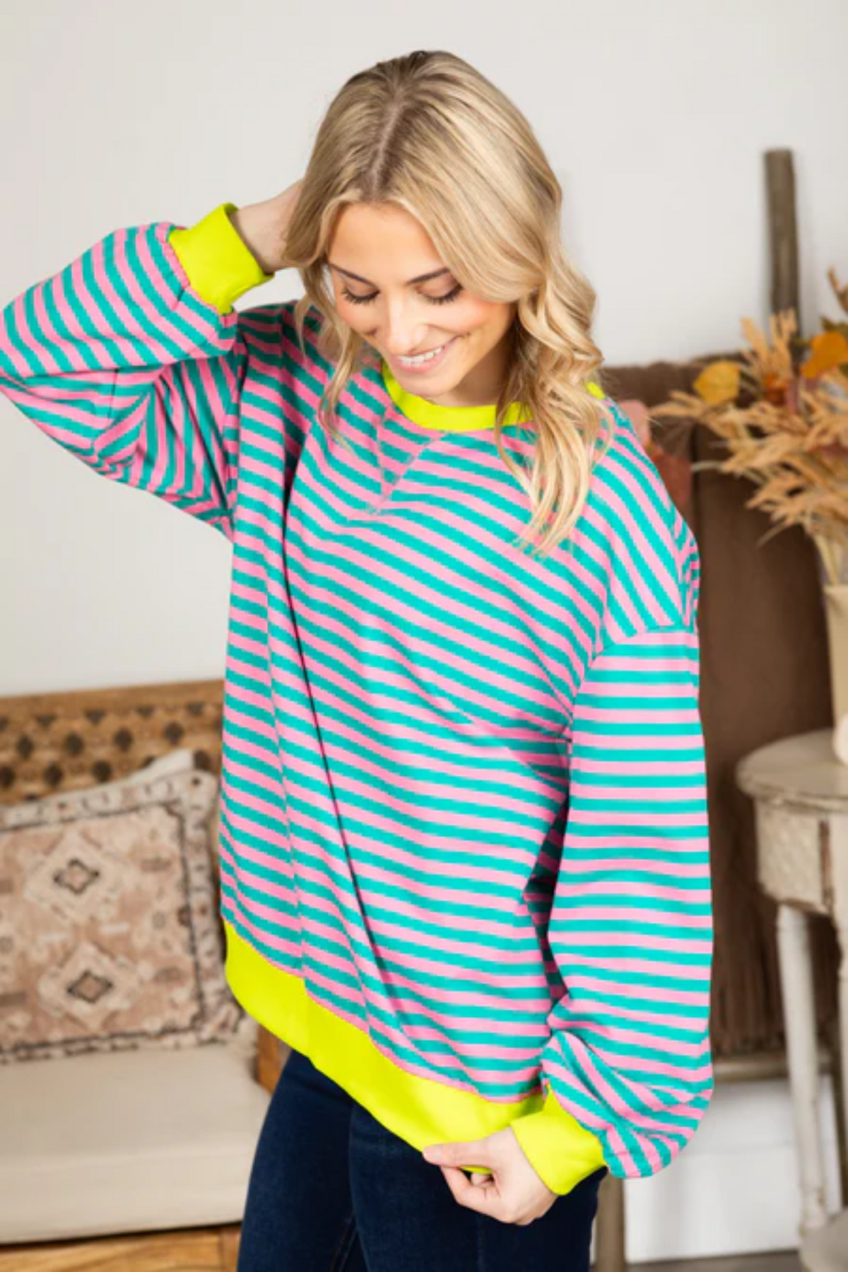 Der Heidi-Mode Kontrast gestreifte Rundhals-Pullover vereint Wärme und Stil auf ideale Weise, perfekt für die kalte Jahreszeit. Mit seinem markanten Streifenmuster und den kontrastierenden Akzenten verleiht dieser Pullover Ihrer Freizeitkleidung mühelosen Charme. Egal, ob Sie zu einem entspannten Treffen gehen oder einen gemütlichen Tag zu Hause verbringen, dieses vielseitige Kleidungsstück sorgt dafür, dass Sie sowohl chic als auch komfortabel bleiben. Kombinieren Sie es mit Ihren Lieblingshosen für einen lässigen, aber modischen Look, der sich für jeden informellen Anlass eignet.