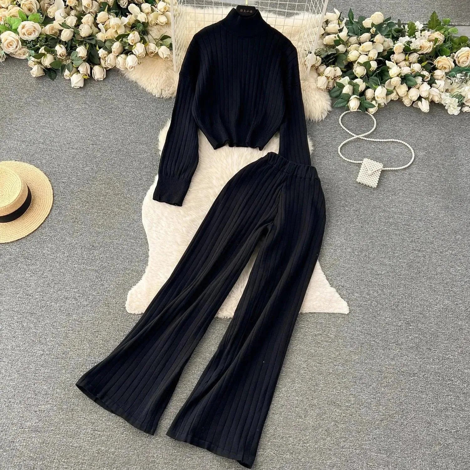 Beiges, Festes Rippendes Weit Beiniges Zweiteiliges Set Für Damen