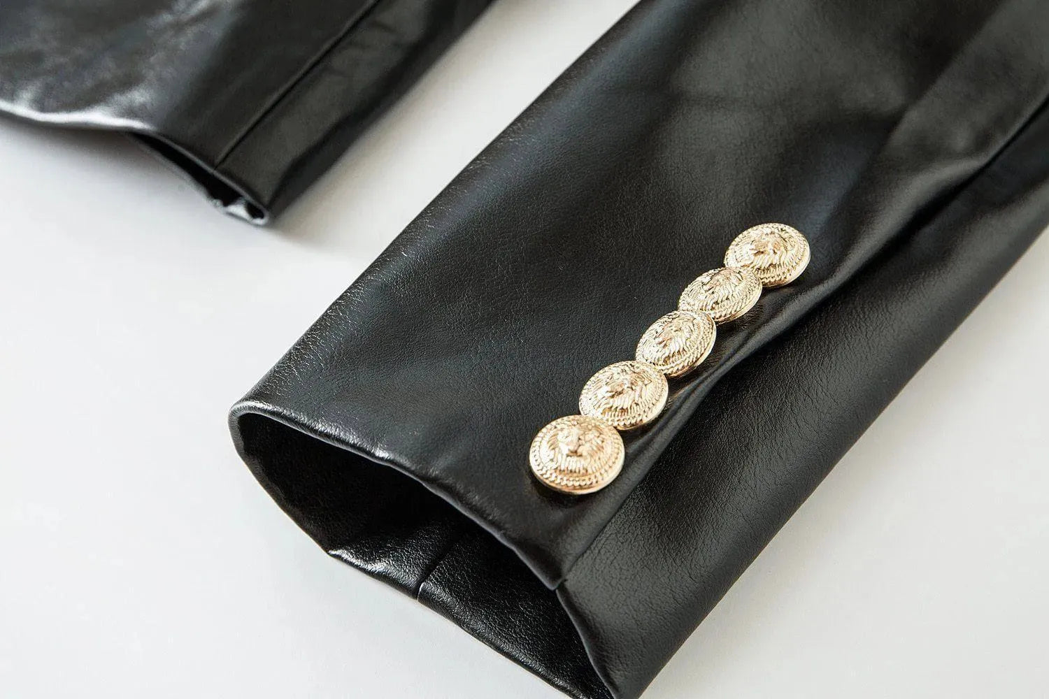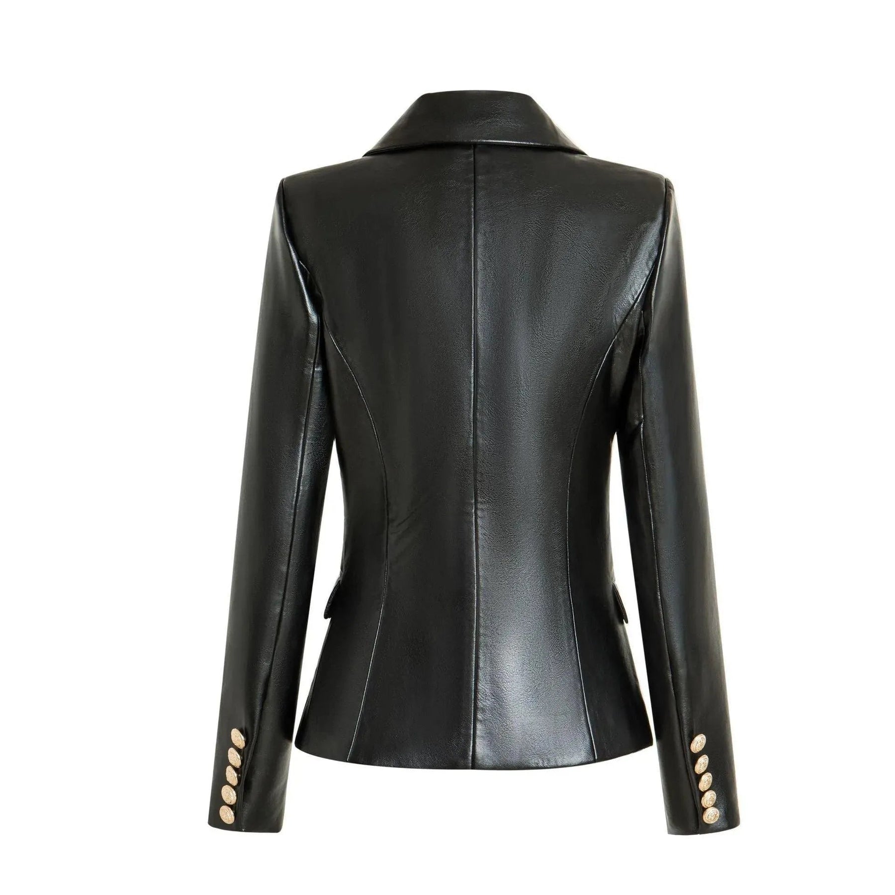 Veredeln Sie Ihren Look mit diesem attraktiven, stilvollen Damenblazer. Das raffinierte Design dieses Lederblazers hat geschmeidige goldene Knöpfe, die einen zusätzlichen Hauch von Eleganz verleihen. Der klassische Reverskragen und die doppelte Knopfleiste setzen stilvolle Akzente.