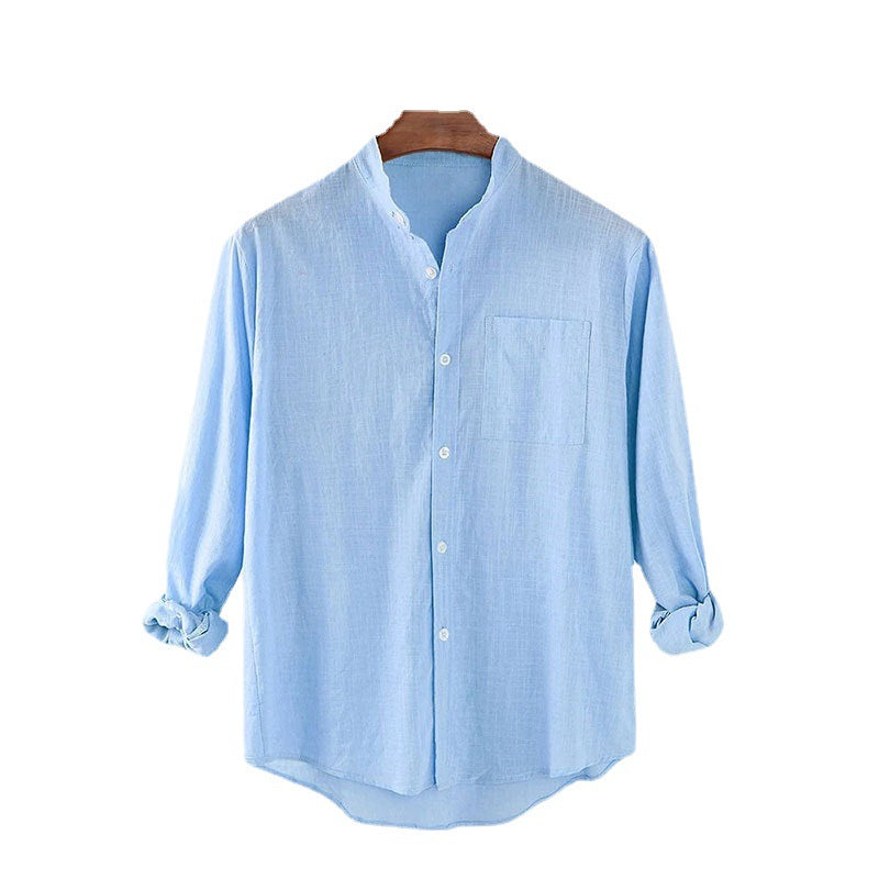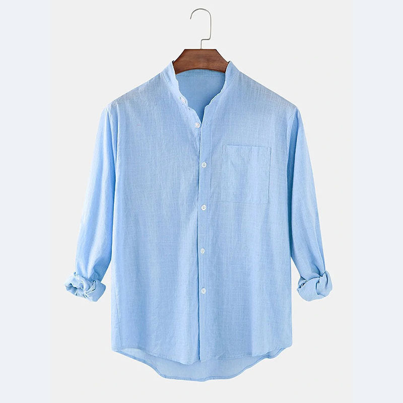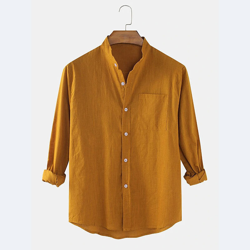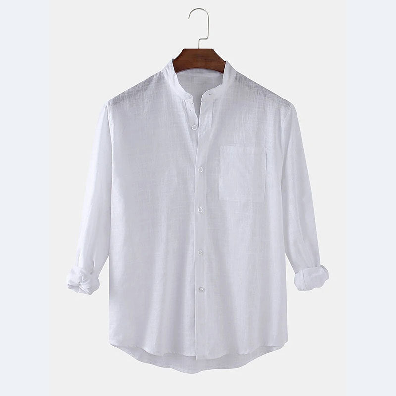 • Design: Das Hemd verfügt über einen modernen Stehkragen und eine durchgehende Knopfleiste, die das schlichte, aber elegante Design unterstreichen.