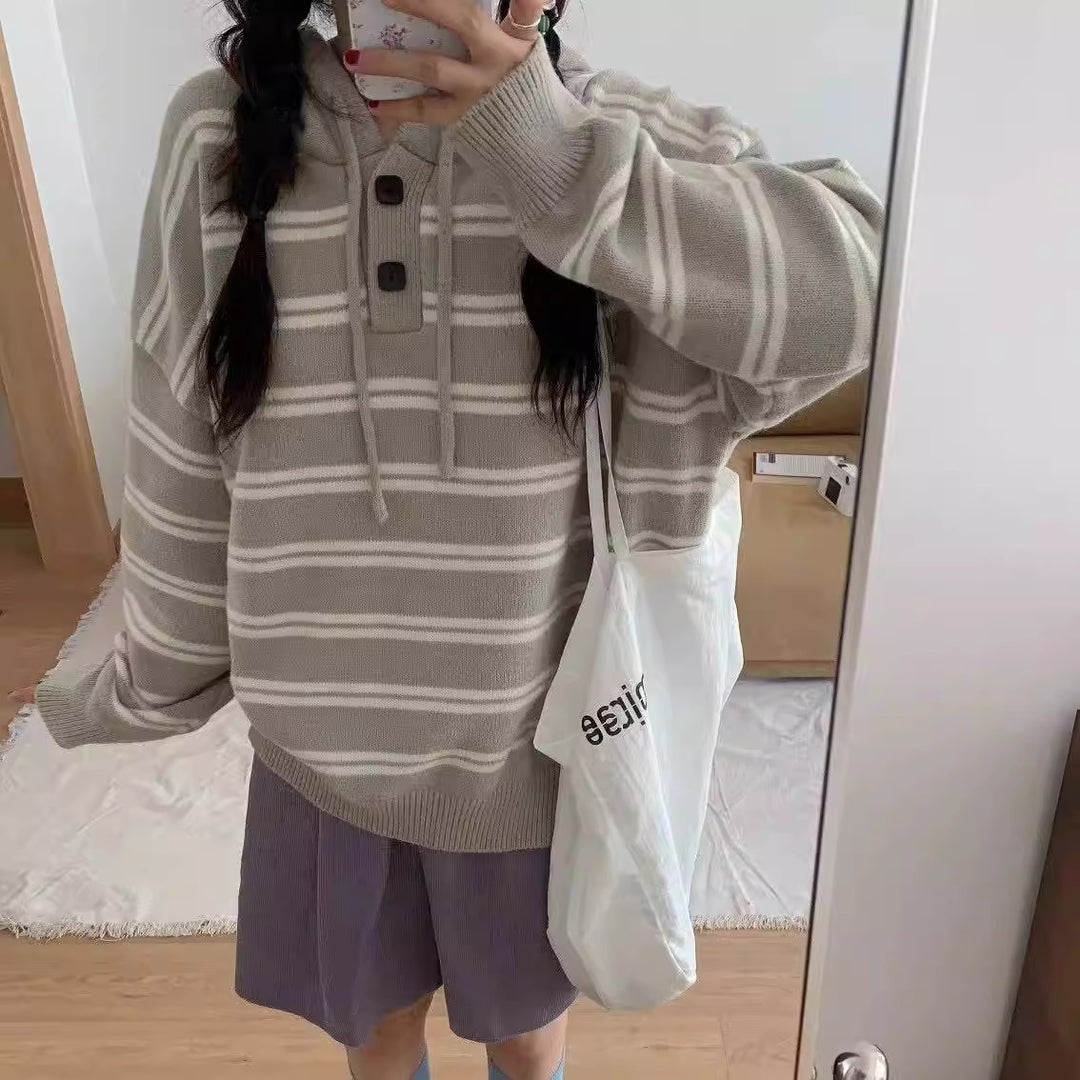 Damen lässiger Streifenpullover mit Knopfleiste und Kapuze Heidi-Mode
