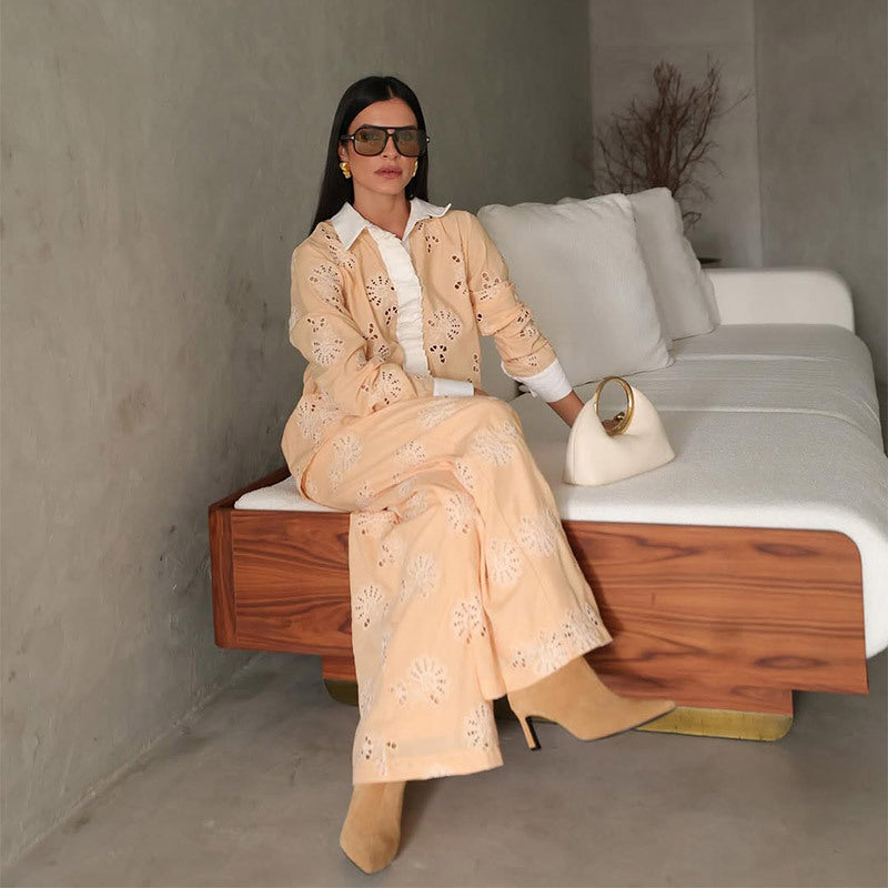 Damen Zweiteiler mit dekorativen Häkelmustern und weitem Schnitt Heidi-Mode