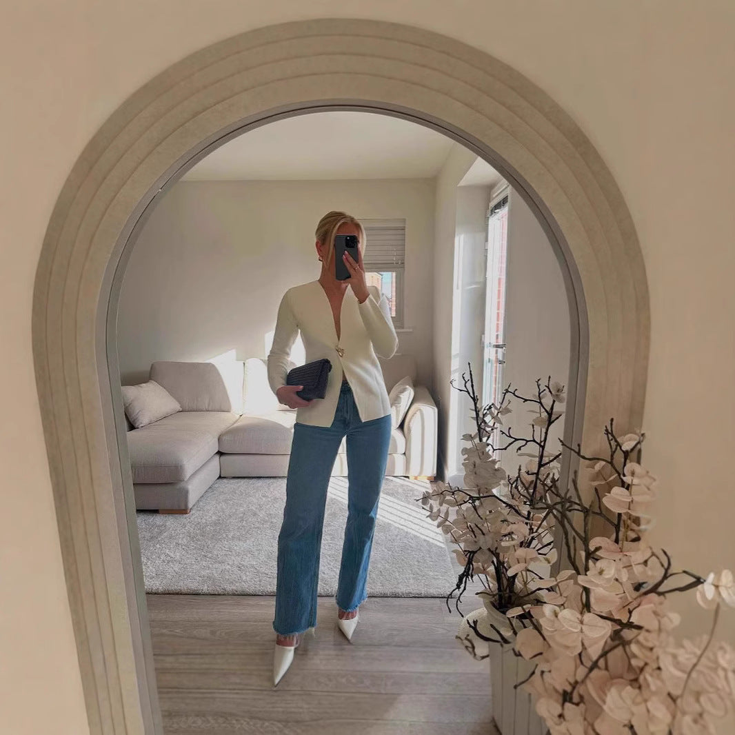 Damen Wickeljacke mit modernem V-Ausschnitt und eleganten Knopfdetails Heidi-Mode