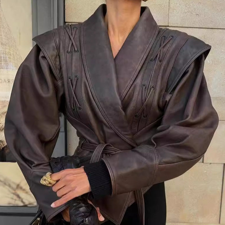 DamenModerne Jacke aus Kunstleder mit Taillengürtel und doppelt gestepptem Design Heidi-Mode