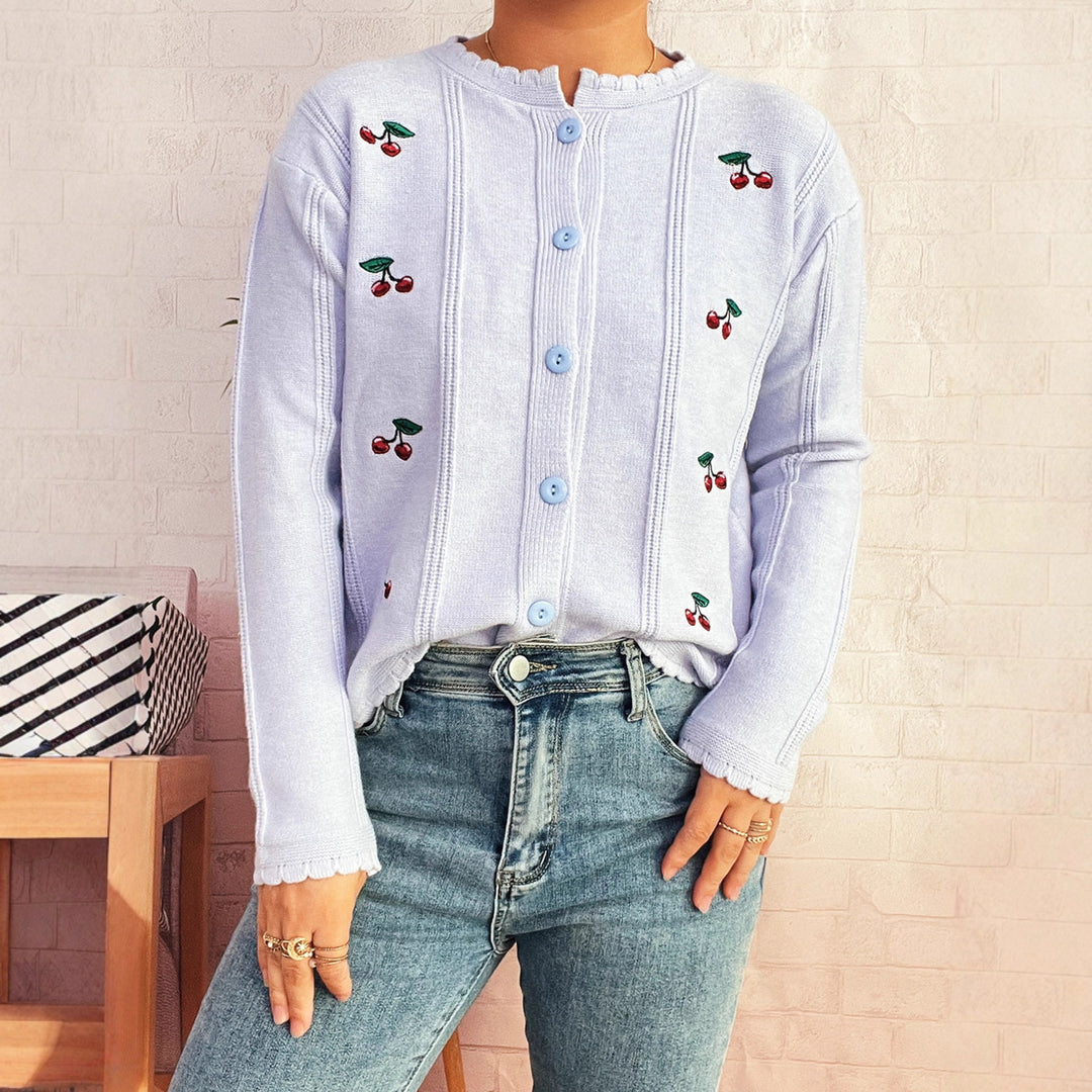 Damen Strickjacke mit verspieltem Kirschmuster und dekorativen Knopfdetails Heidi-Mode
