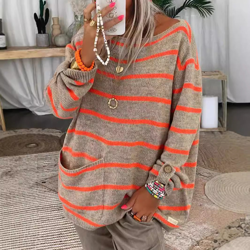 Damen lässiger Strickpullover mit kontrastierenden Streifen und weitem Schnitt Heidi-Mode