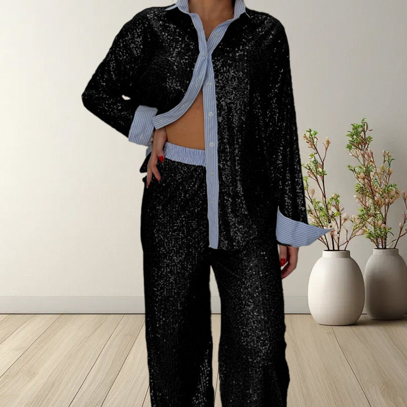 Damen Glitzerndes Pyjama-Set aus hochwertigem Material mit Schalkragen und eleganten Akzenten Heidi-Mode