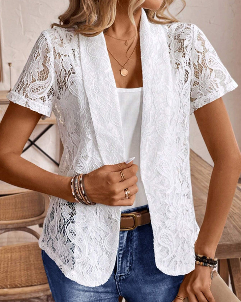 Heidi-Mode | Weißer Kurzärmeliger Spitzenblazer mit Revers