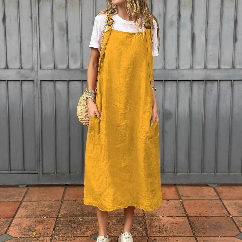 Damen Lässiges Leinen-Latzkleid mit praktischen Seitentaschen und verstellbaren Trägern Heidi-Mode